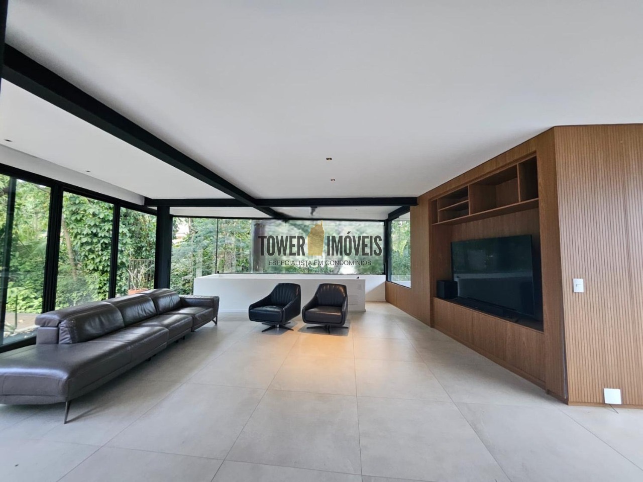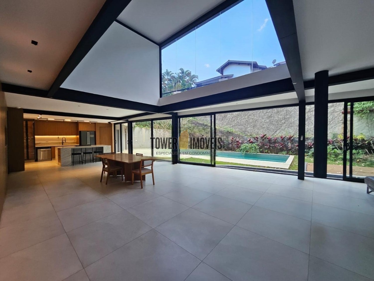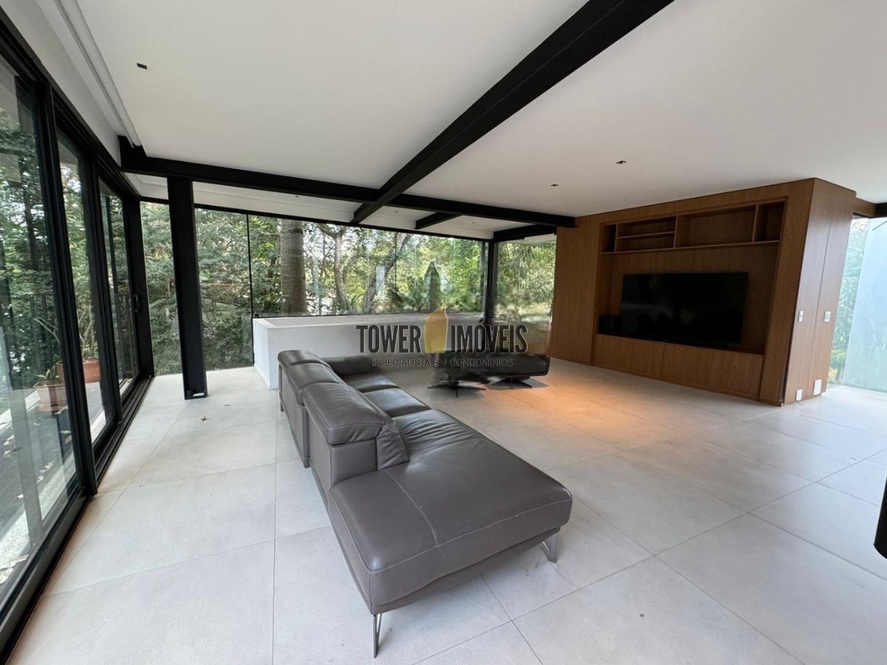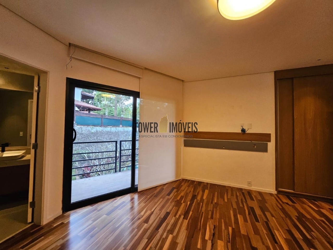 Possui 3 suítes com armários embutidos, sendo 2 suítes com closet e a suíte do casal com cortina automatizada, sala de estar, sala de jantar ampla, cozinha americana com armários embutidos, lavanderia, lavabo, belíssimo quintal rodeado por muita área verde, piscina, sala de TV com fechamento em vidro, vista para mata e com banheiro social.
