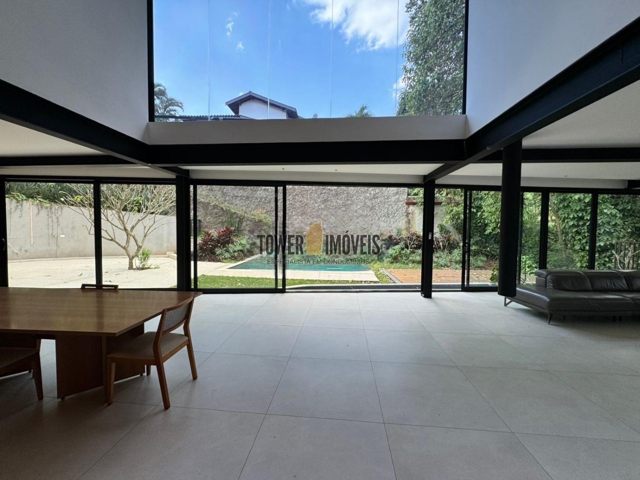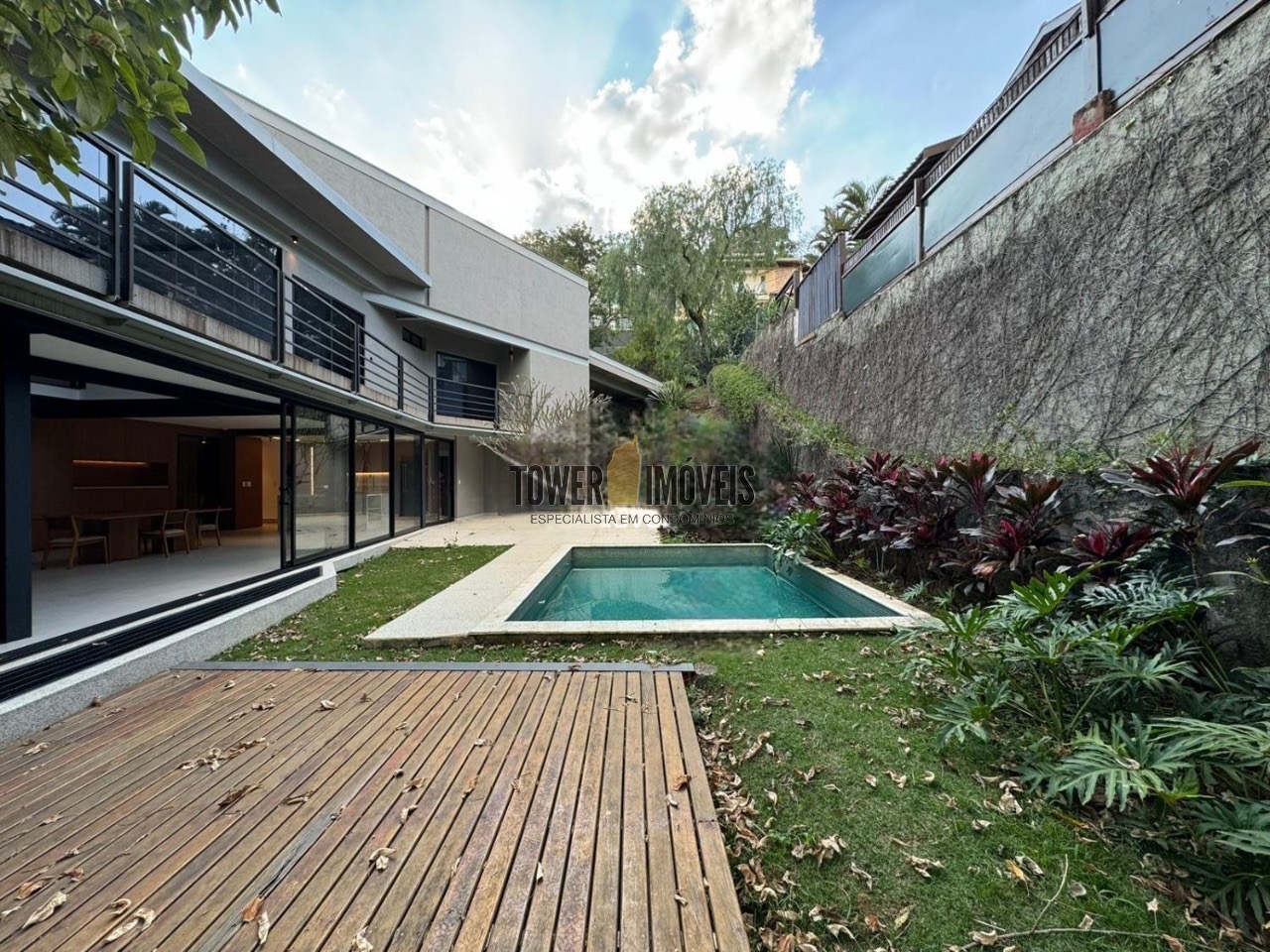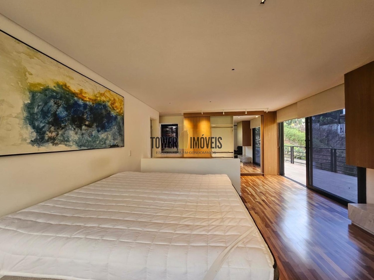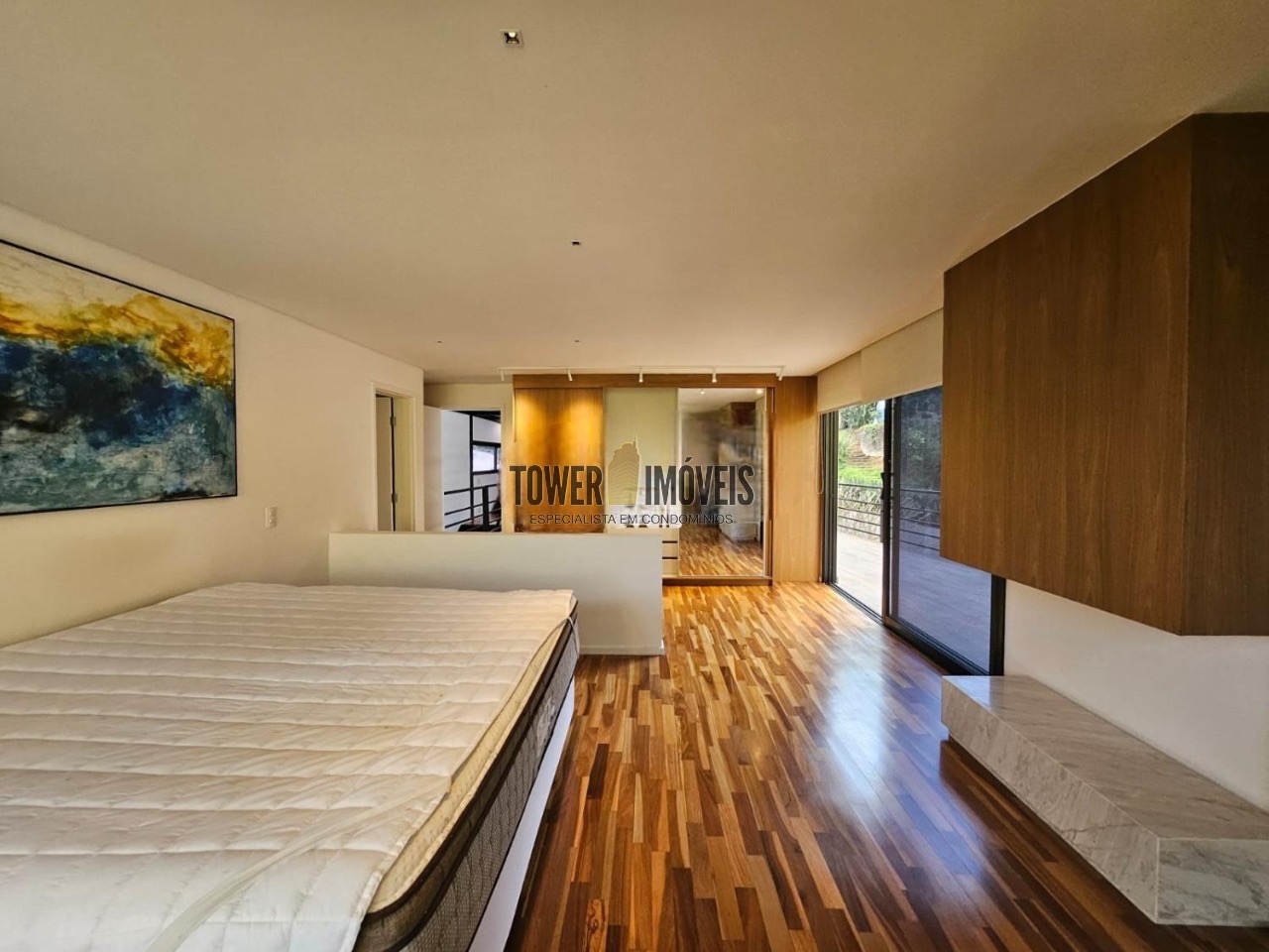 Possui 3 suítes com armários embutidos, sendo 2 suítes com closet e a suíte do casal com cortina automatizada, sala de estar, sala de jantar ampla, cozinha americana com armários embutidos, lavanderia, lavabo, belíssimo quintal rodeado por muita área verde, piscina, sala de TV com fechamento em vidro, vista para mata e com banheiro social.