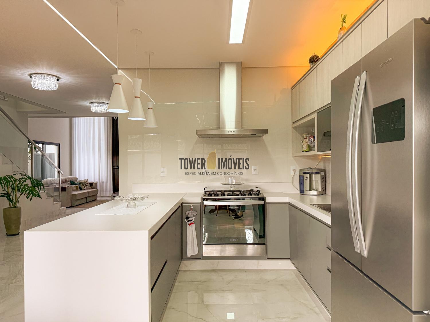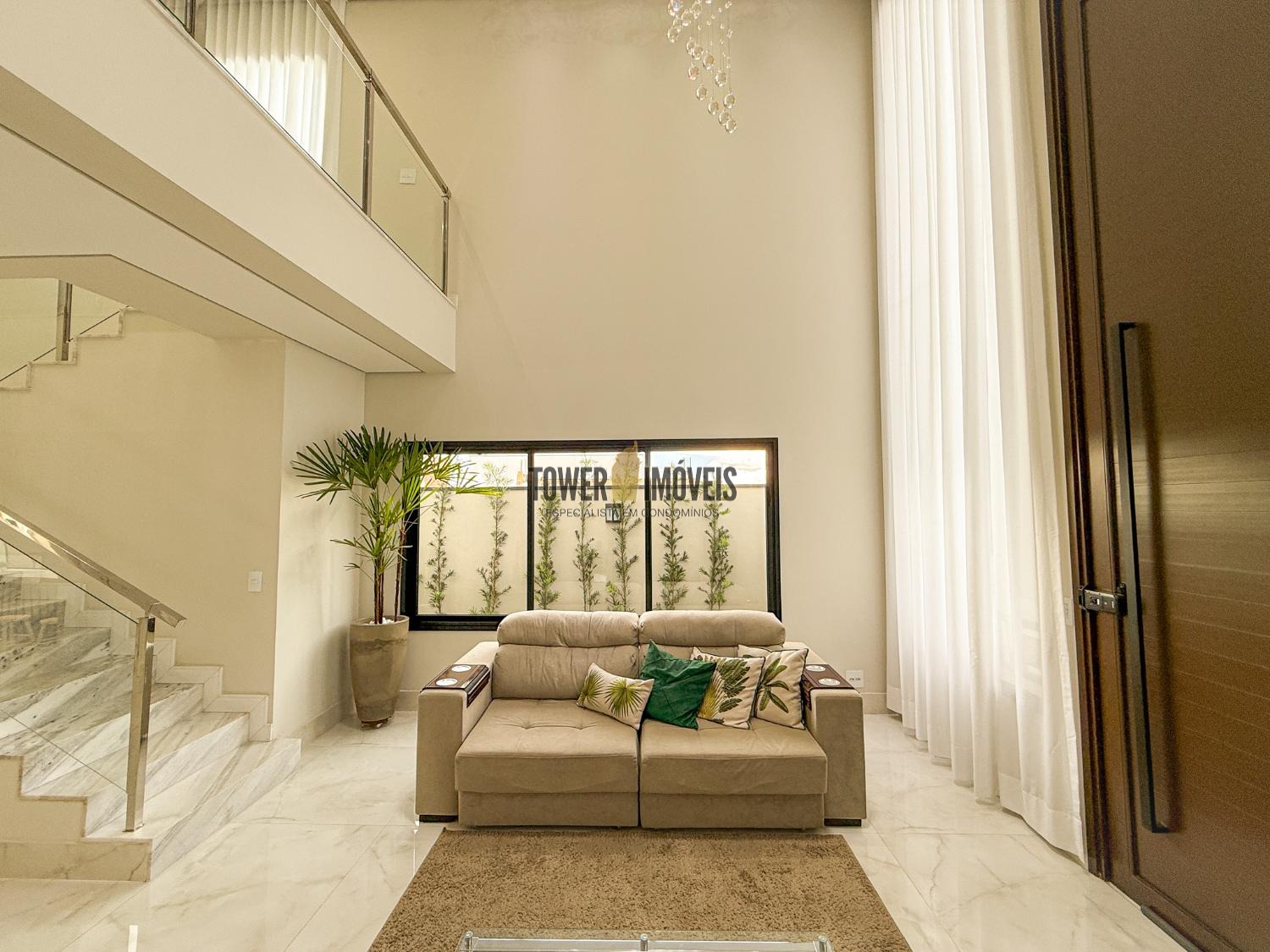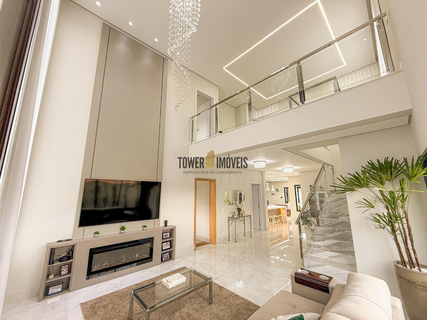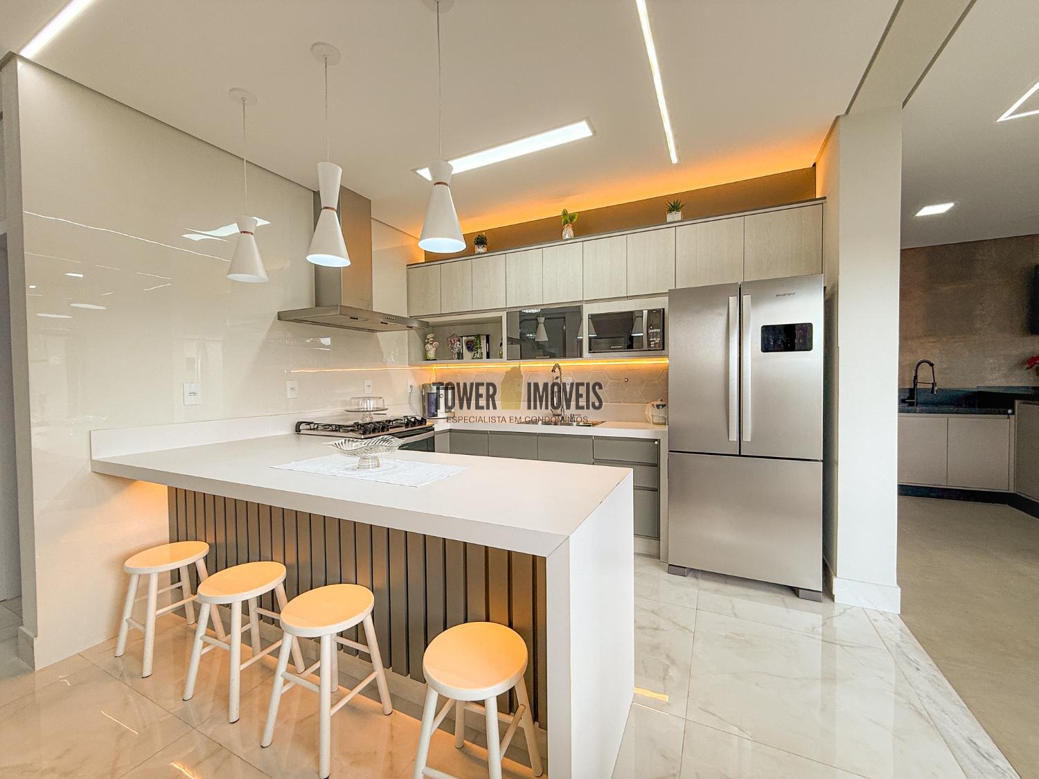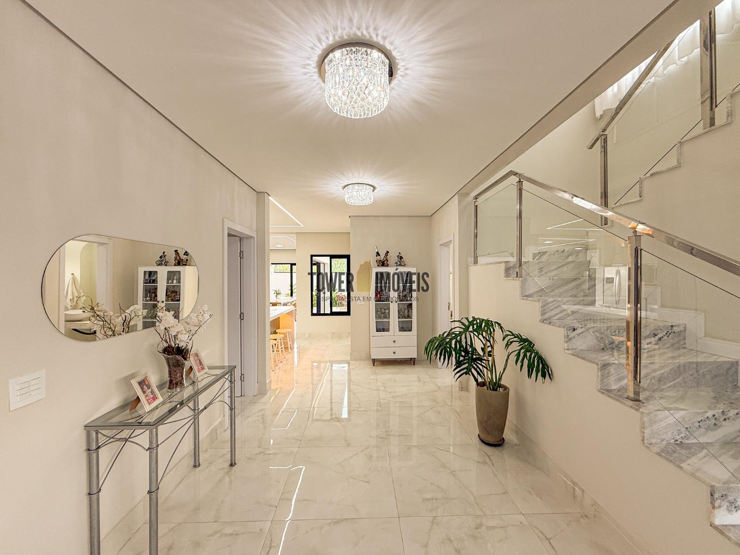Projeto moderno, sofisticado e prático. Com ótimos acabamentos, projeto de iluminação em Led na casa toda. Piso inferior todo integrado, com sala de estar ampla, lareira elétrica, pé direito alto, lavabo, suíte térrea com varanda, linda cozinha americana repleta de armários, balcão, despensa, área de serviço com armários.