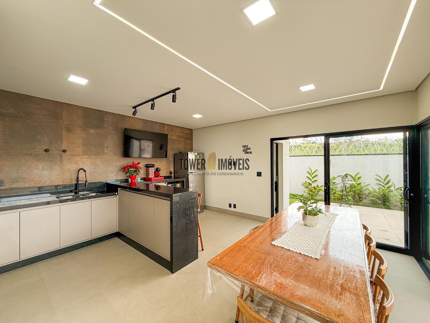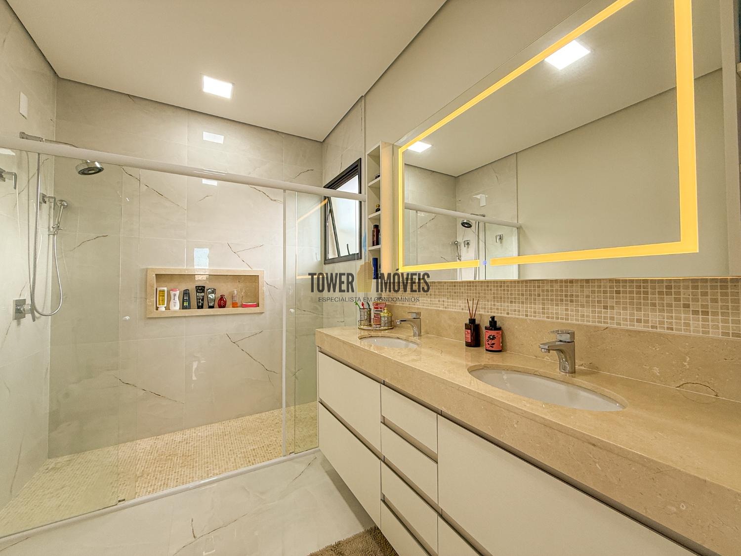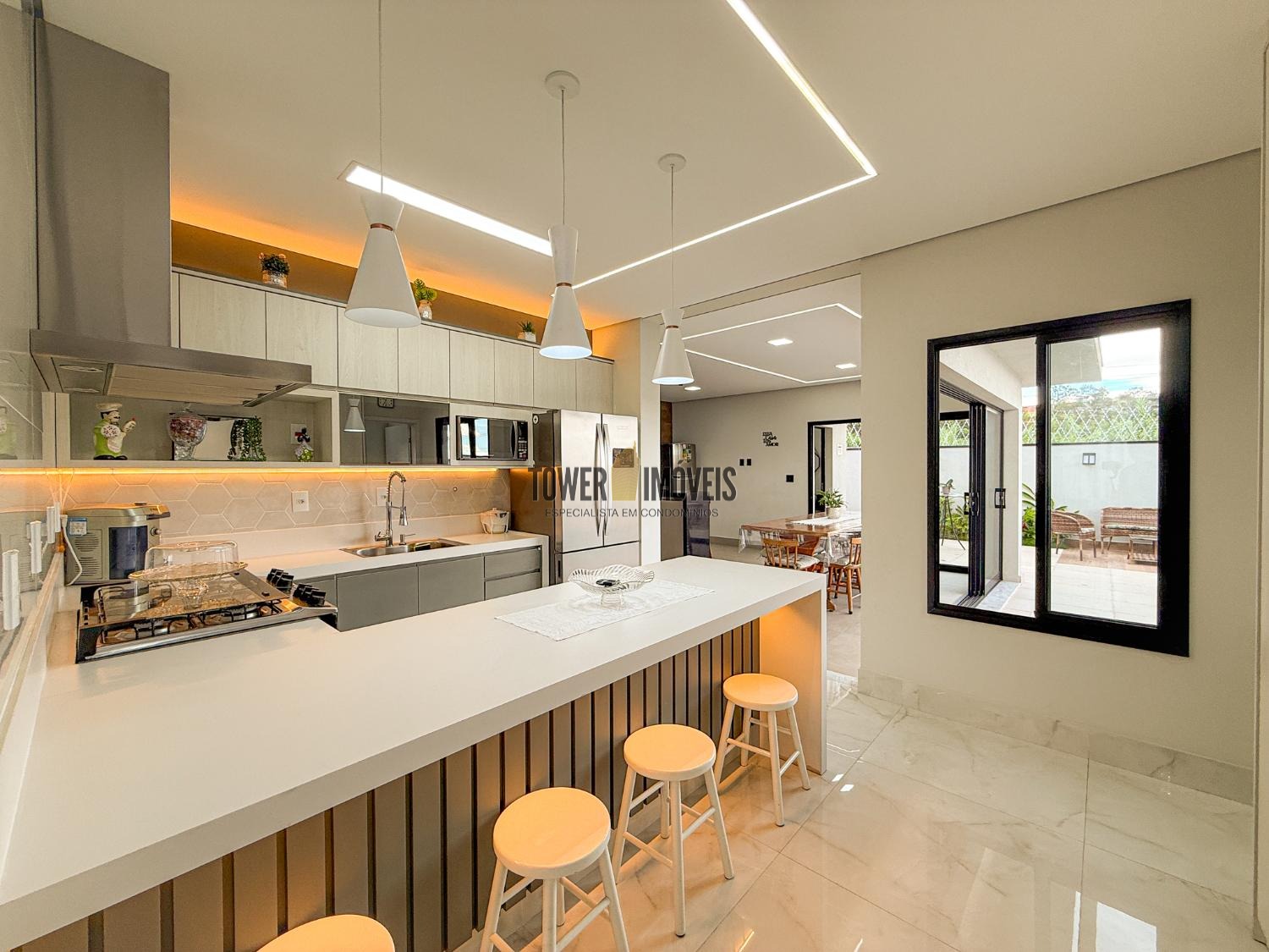 Área gourmet interna, muito espaçosa e moderna, com churrasqueira á gás, cooktop industrial, balcão e armários. Área externa com piscina aquecida, iluminada, com ilha, cascata e piso térmico antiderrapante. Quintal com banheiro completo e jardim. No piso superior, são 2 suítes, com varandas, ar condicionado, ricas em armários, escritório (ou dormitório) e uma sala íntima. A casa é ultra moderna, com 264m de construção e 300m de terreno, pisos em porcelanato, vinílico e mármore. Energia fotovoltaica. São 4 vagas de garagem. Condomínio novo com toda a estrutura de segurança e portaria 24 horas e área de lazer completa.