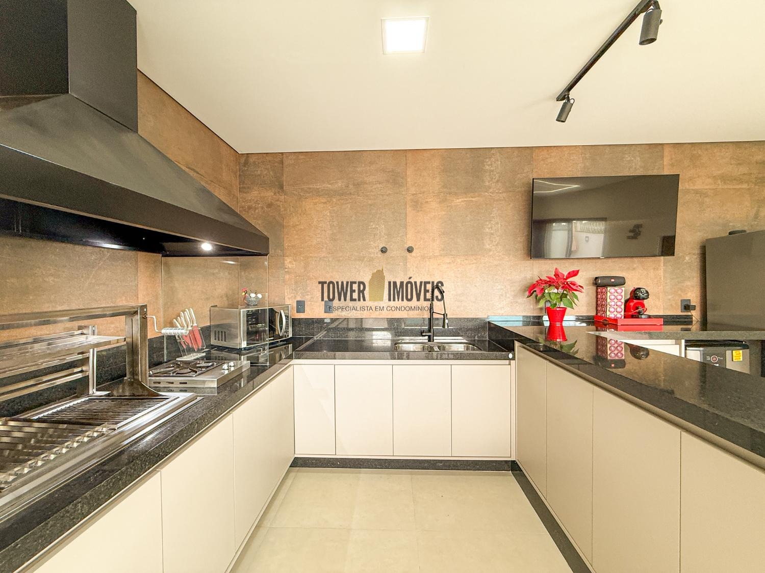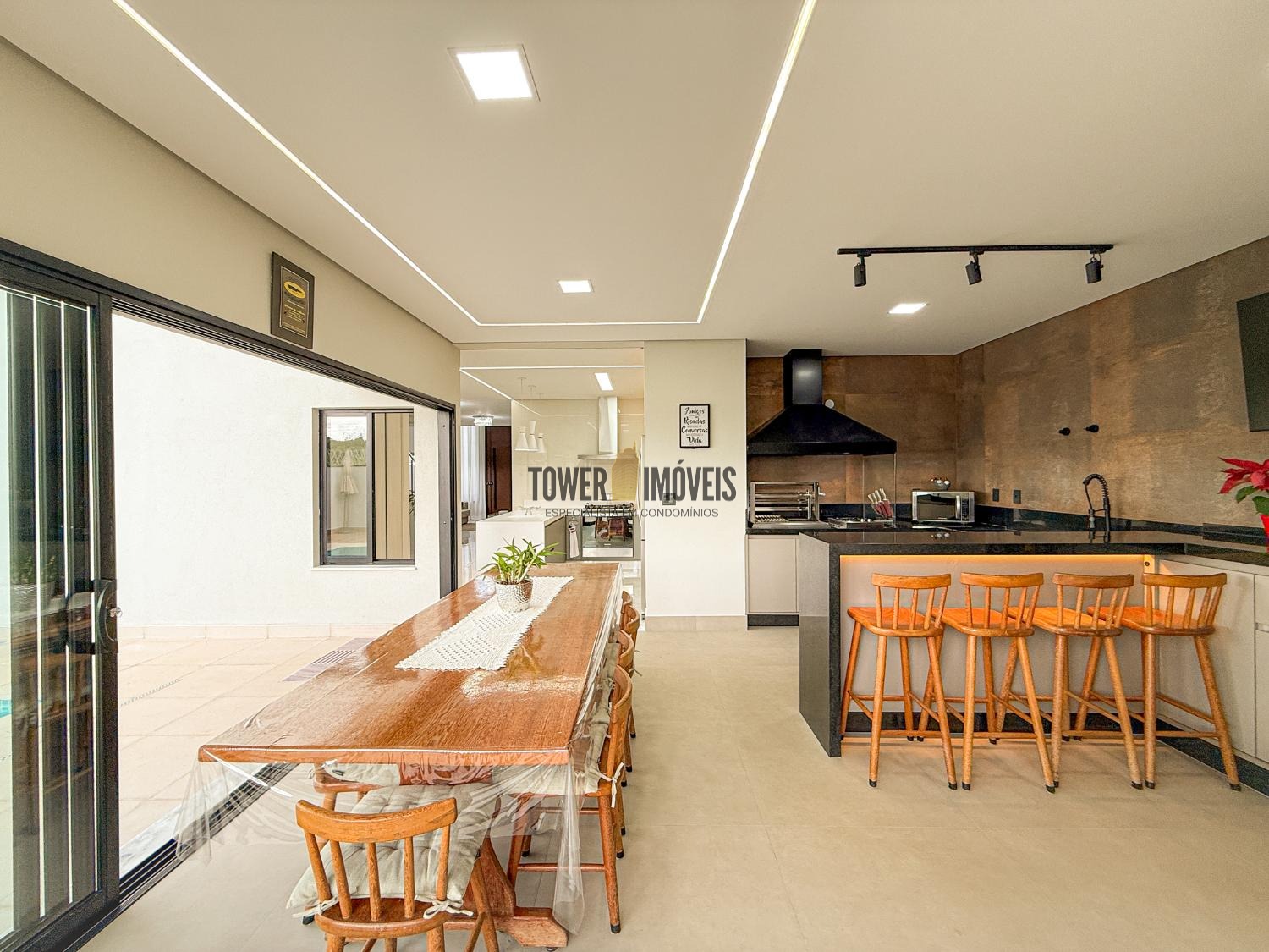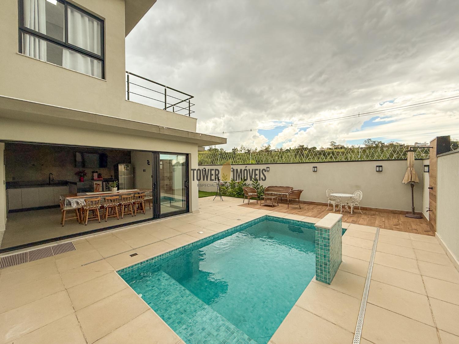 Área gourmet interna, muito espaçosa e moderna, com churrasqueira á gás, cooktop industrial, balcão e armários. Área externa com piscina aquecida, iluminada, com ilha, cascata e piso térmico antiderrapante. Quintal com banheiro completo e jardim. No piso superior, são 2 suítes, com varandas, ar condicionado, ricas em armários, escritório (ou dormitório) e uma sala íntima. A casa é ultra moderna, com 264m de construção e 300m de terreno, pisos em porcelanato, vinílico e mármore. Energia fotovoltaica. São 4 vagas de garagem. Condomínio novo com toda a estrutura de segurança e portaria 24 horas e área de lazer completa.