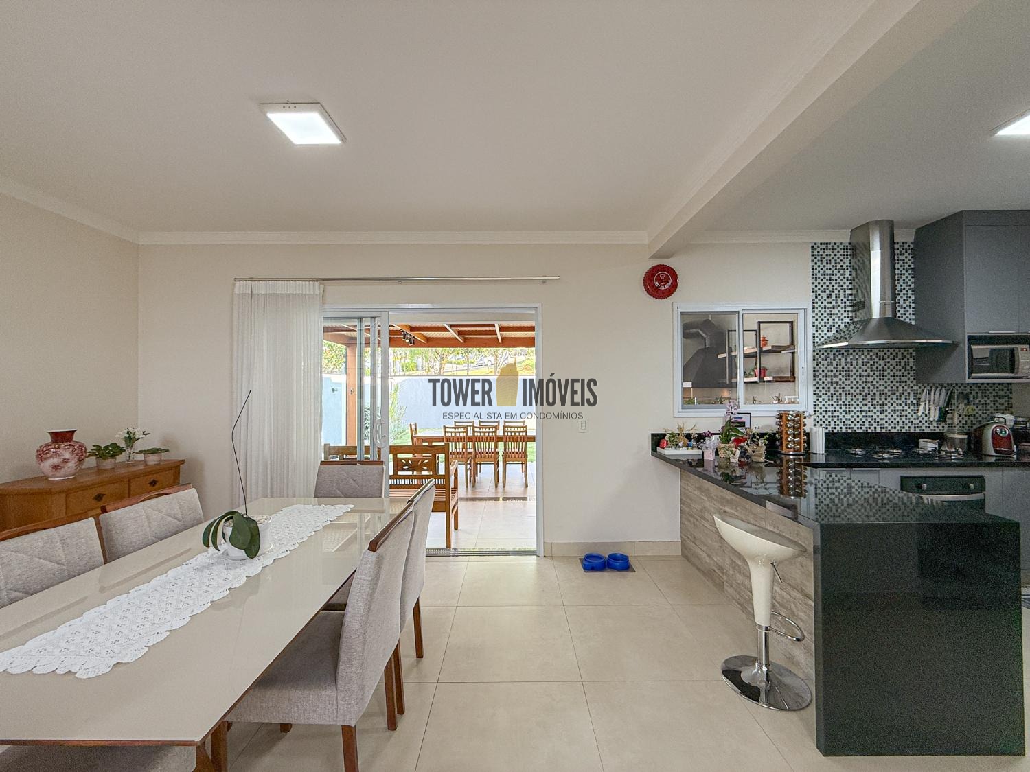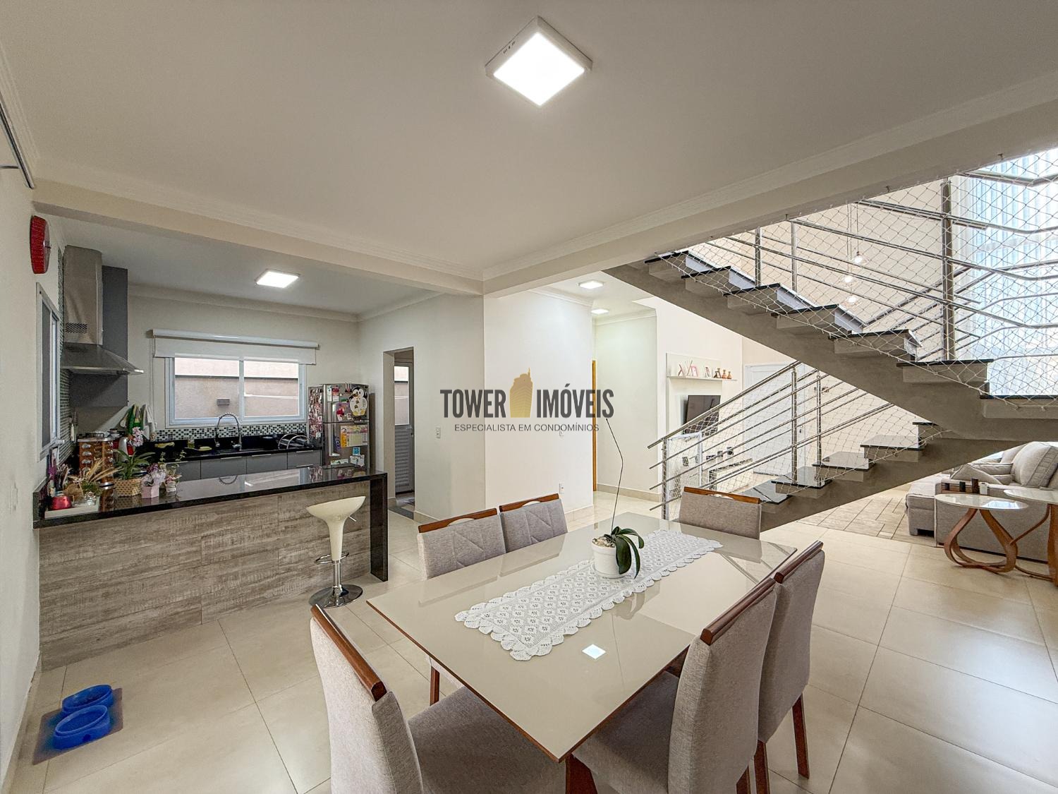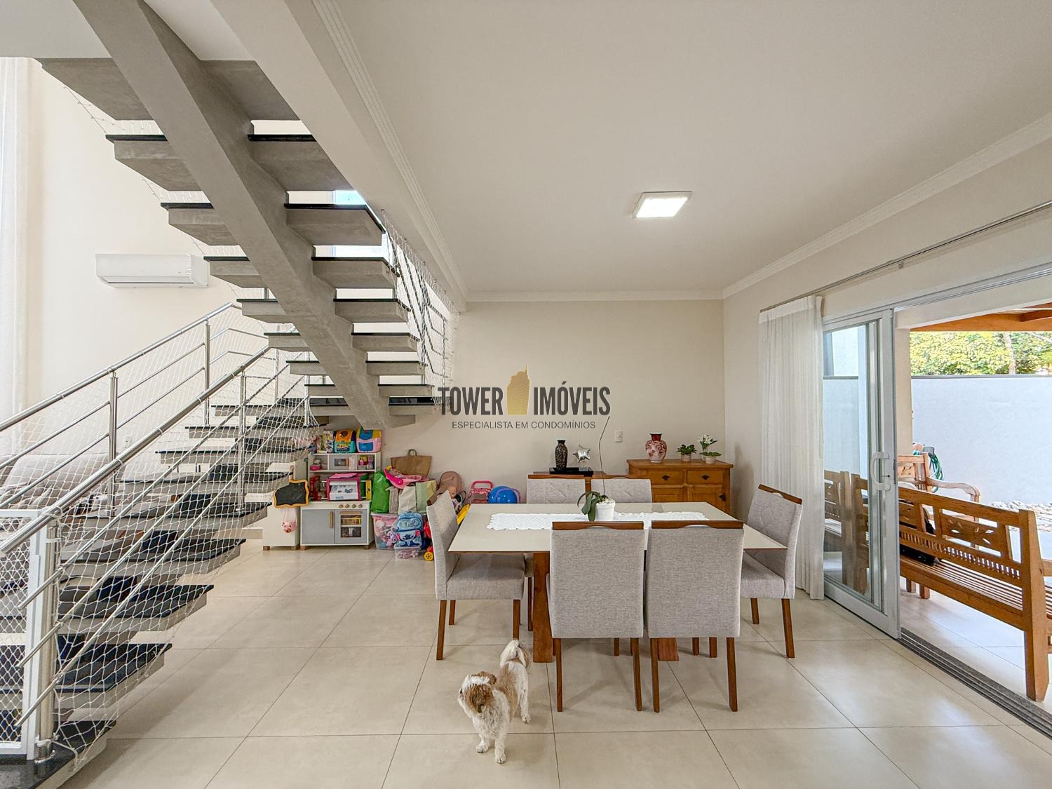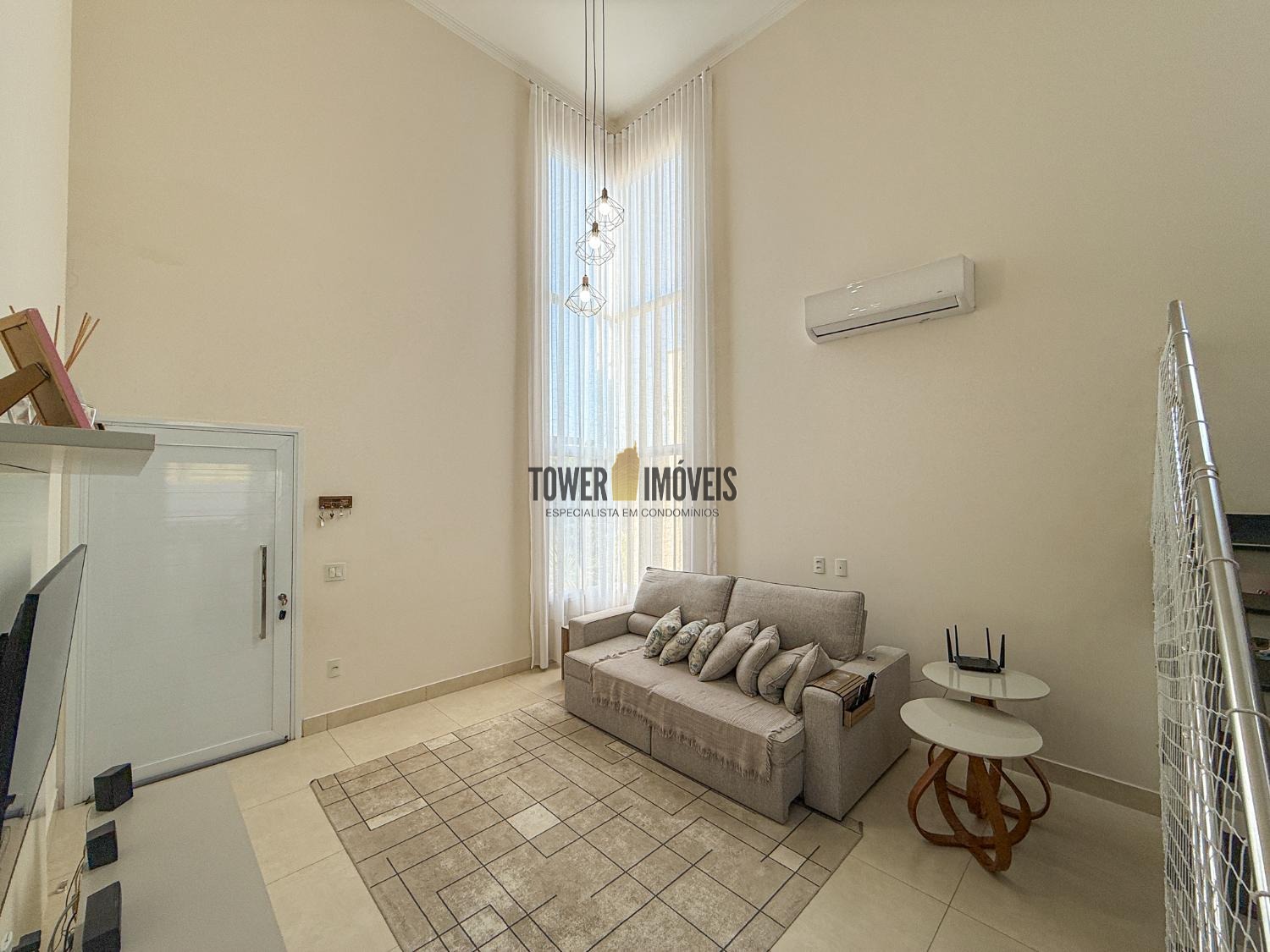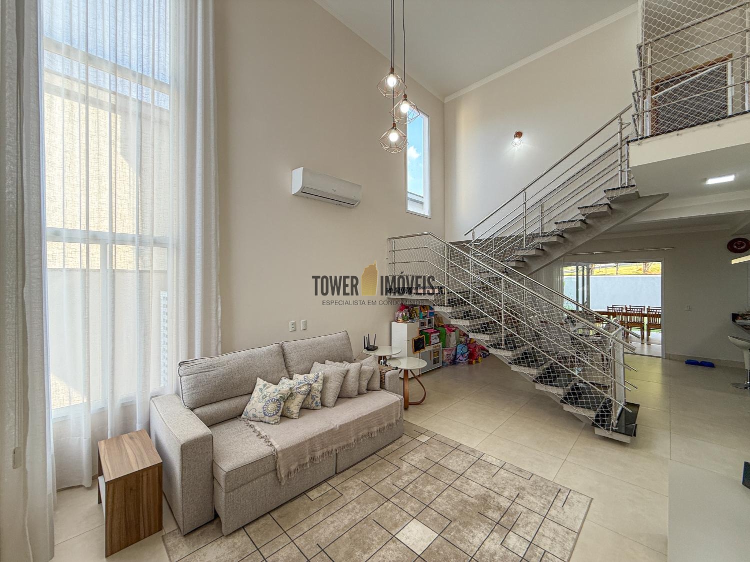 Ar condicionado na sala, pé direito alto, lavabo, sala de jantar, cozinha americana, despensa e lavanderia.