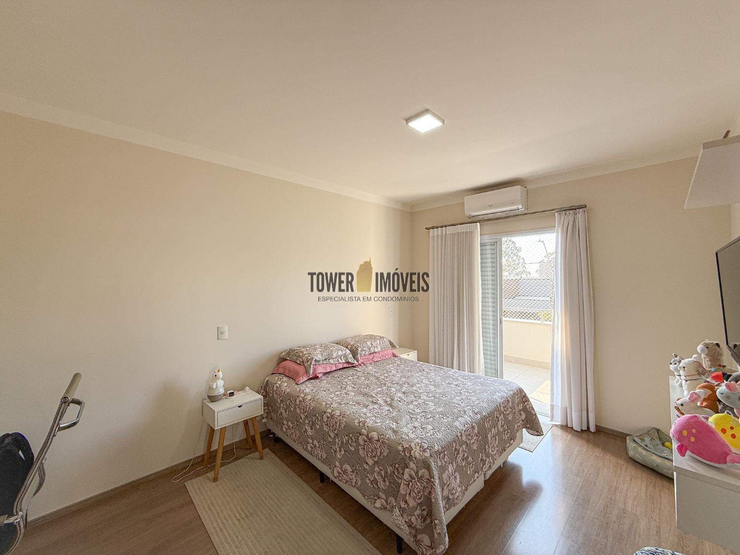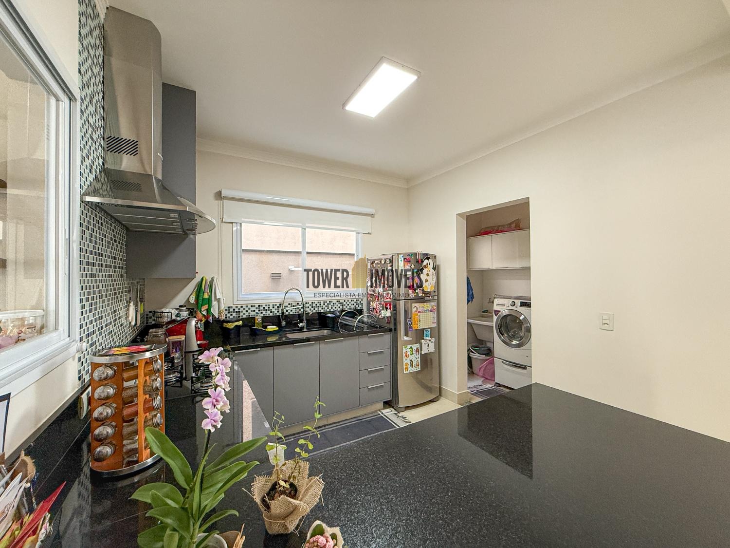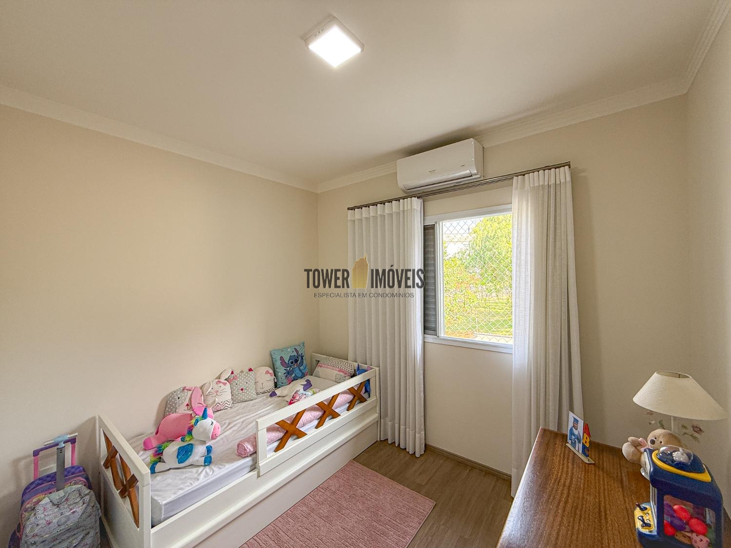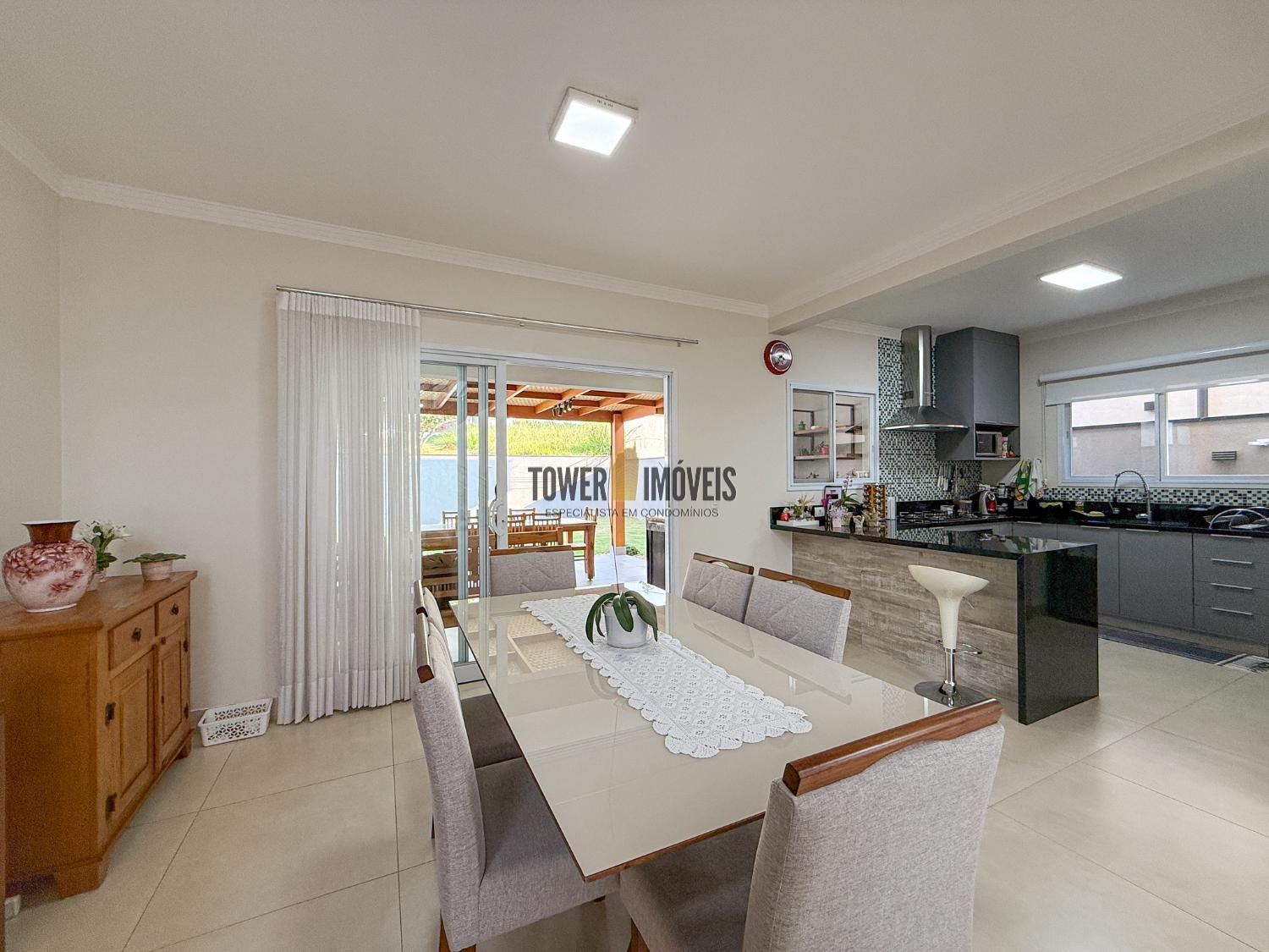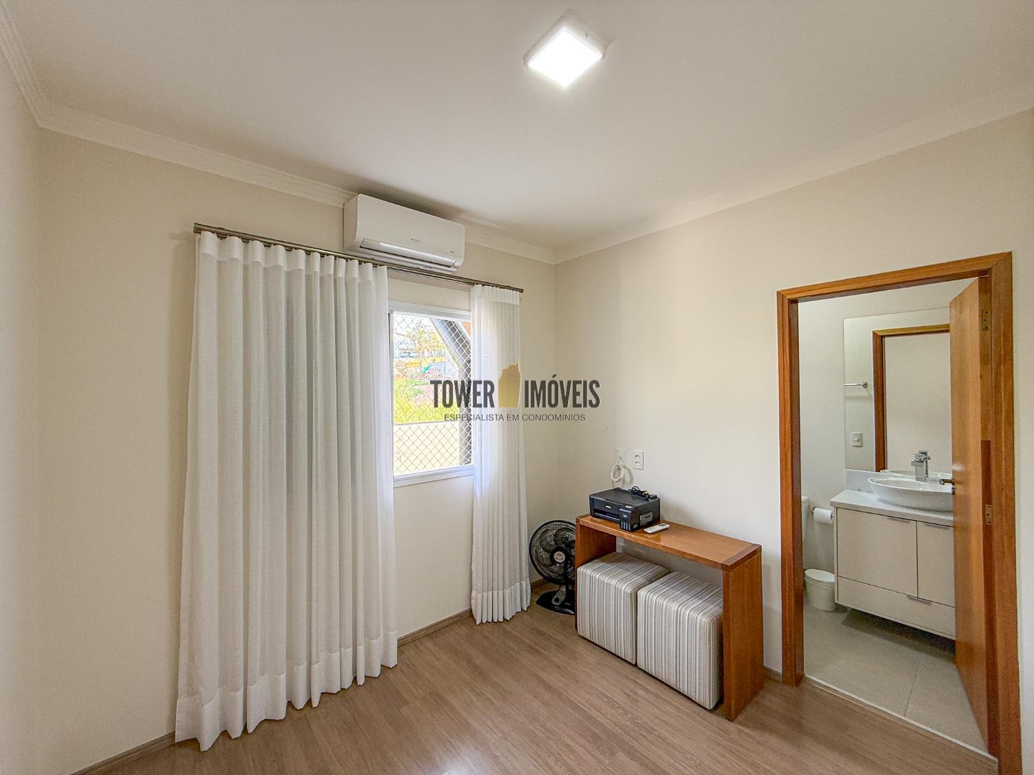 Ar condicionado na sala, pé direito alto, lavabo, sala de jantar, cozinha americana, despensa e lavanderia.