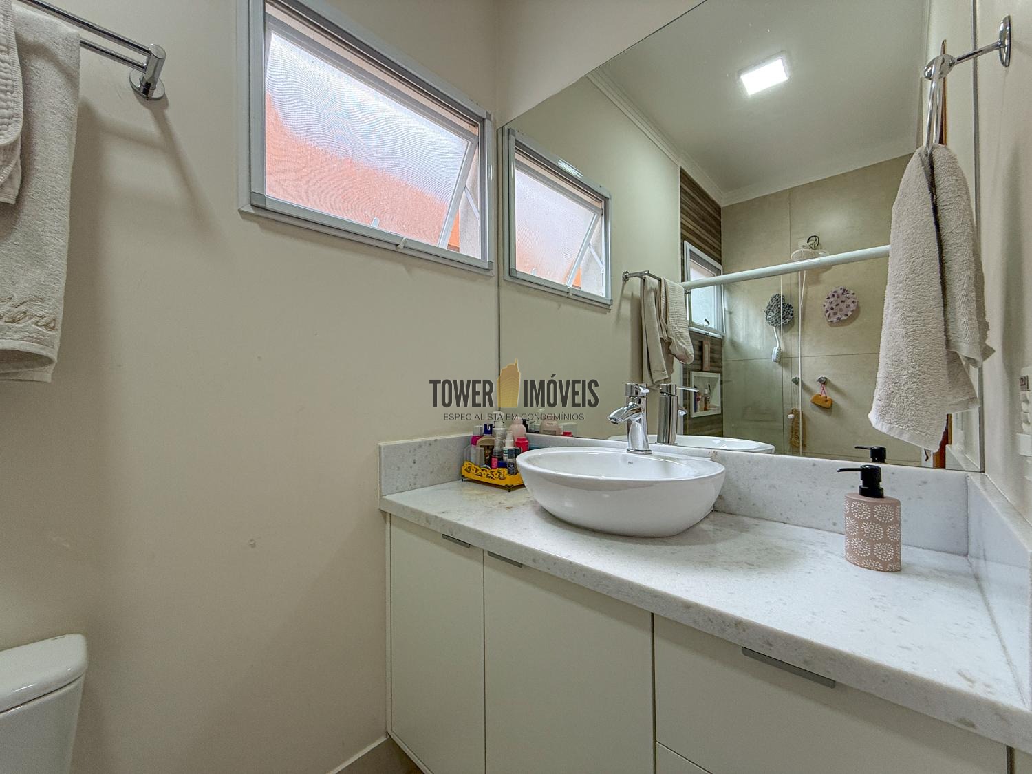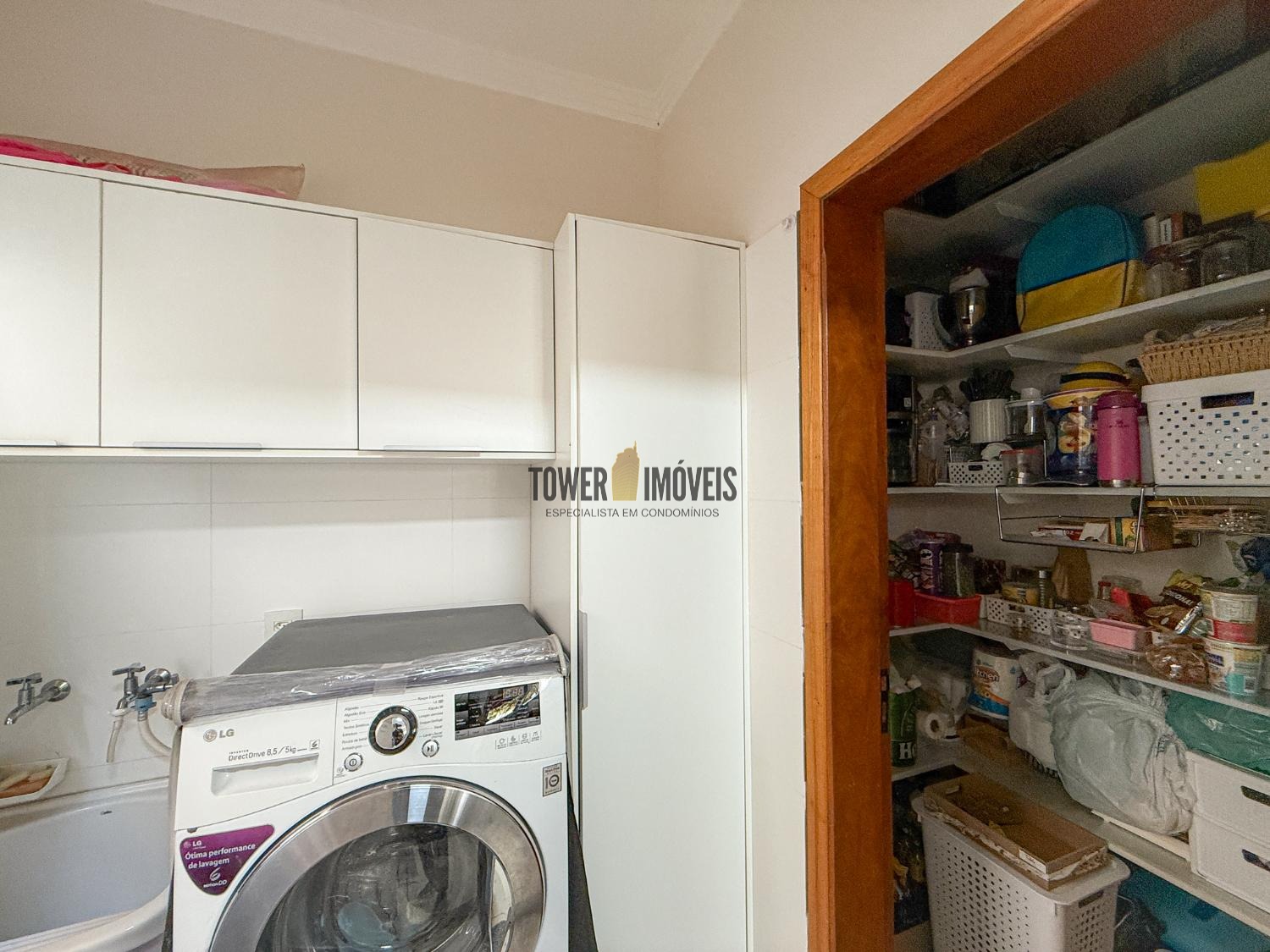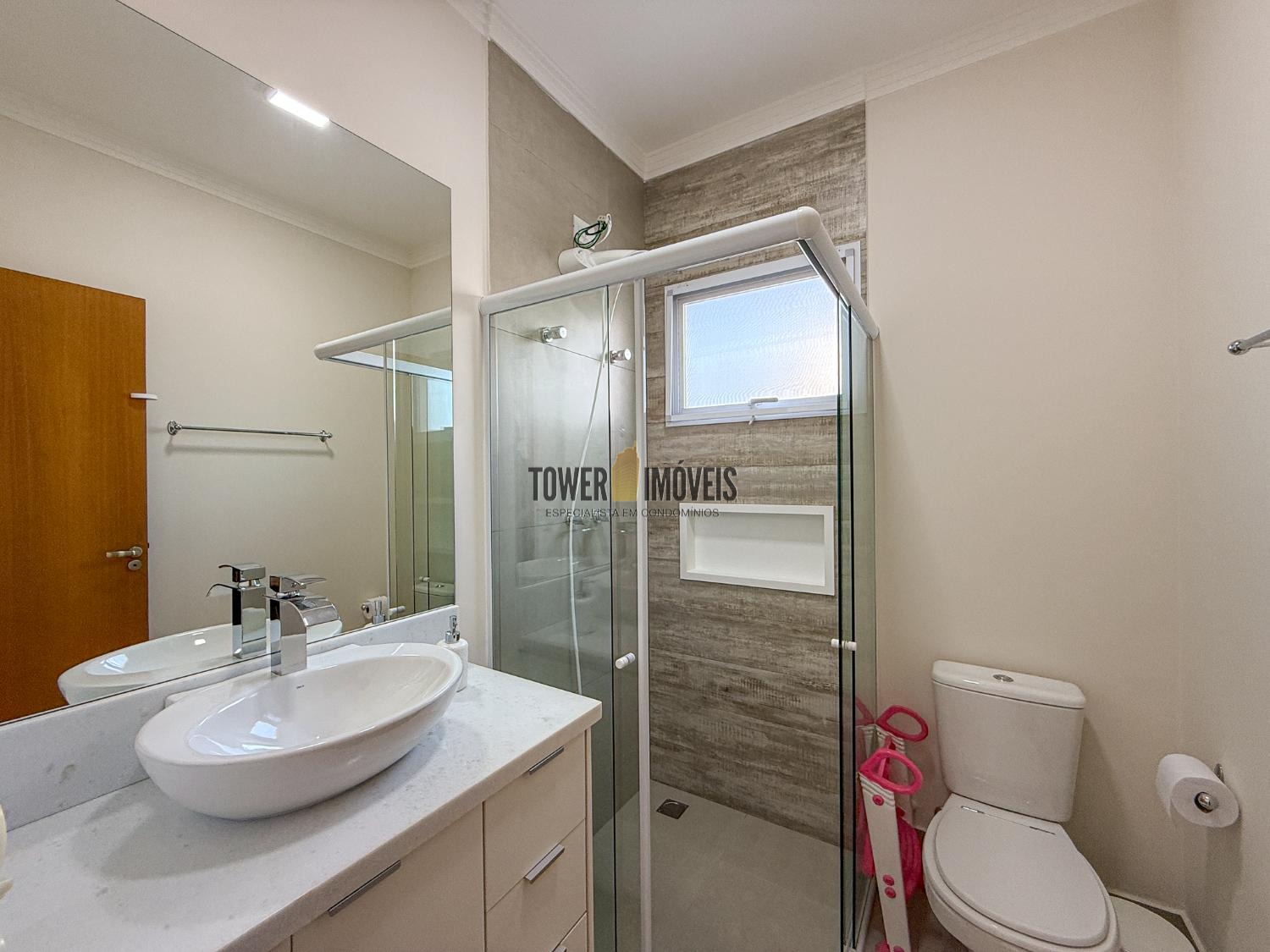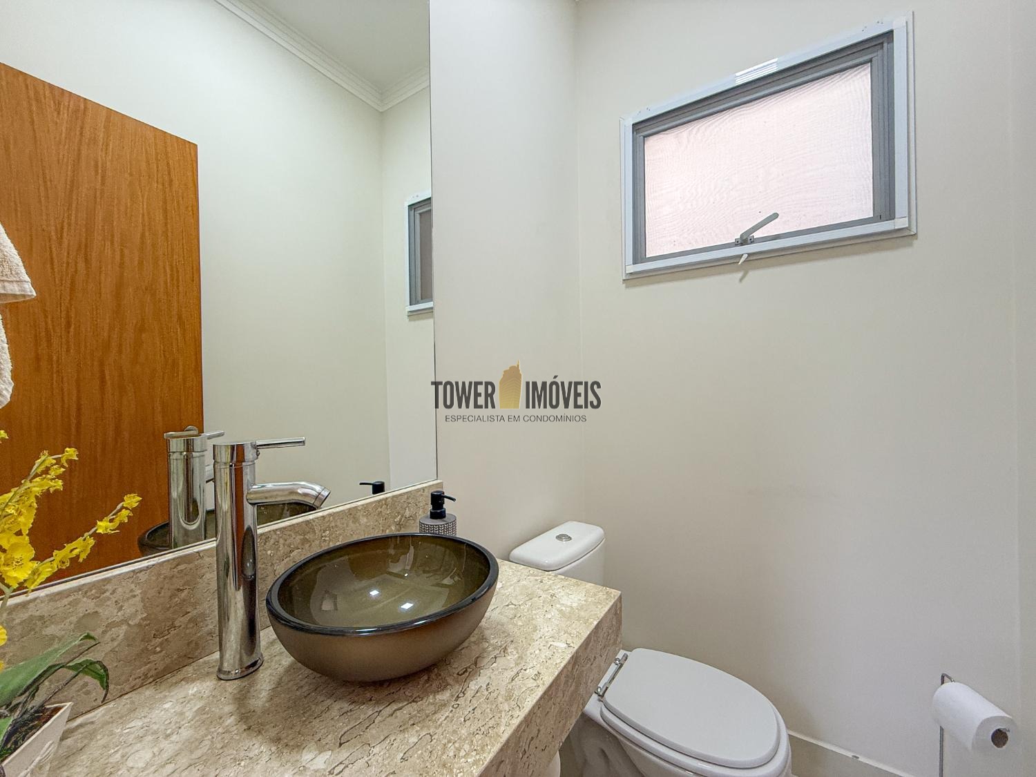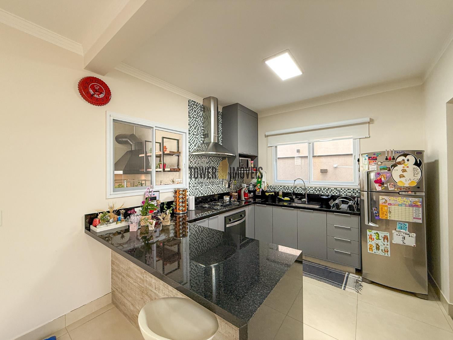 Ar condicionado na sala, pé direito alto, lavabo, sala de jantar, cozinha americana, despensa e lavanderia.
