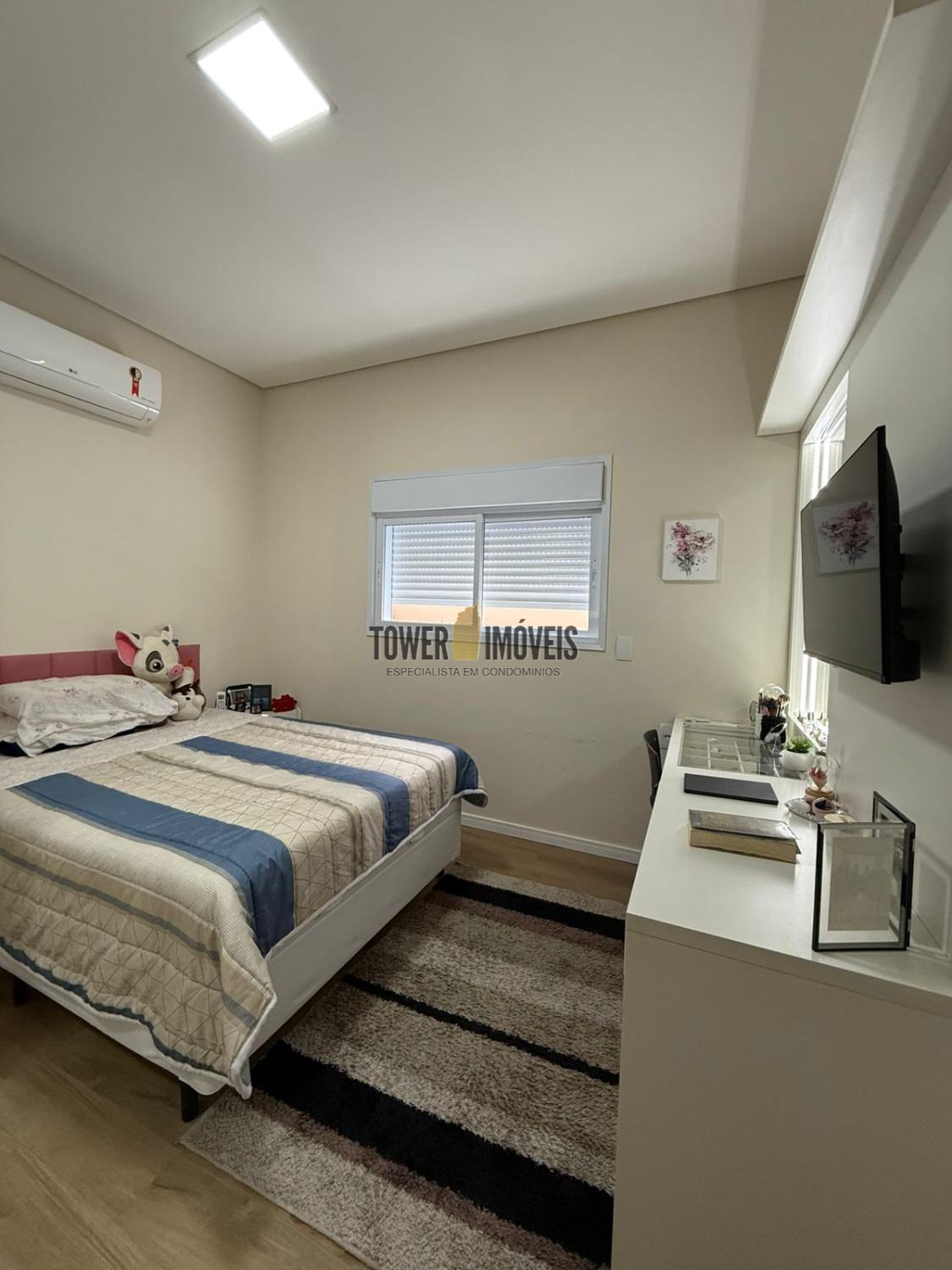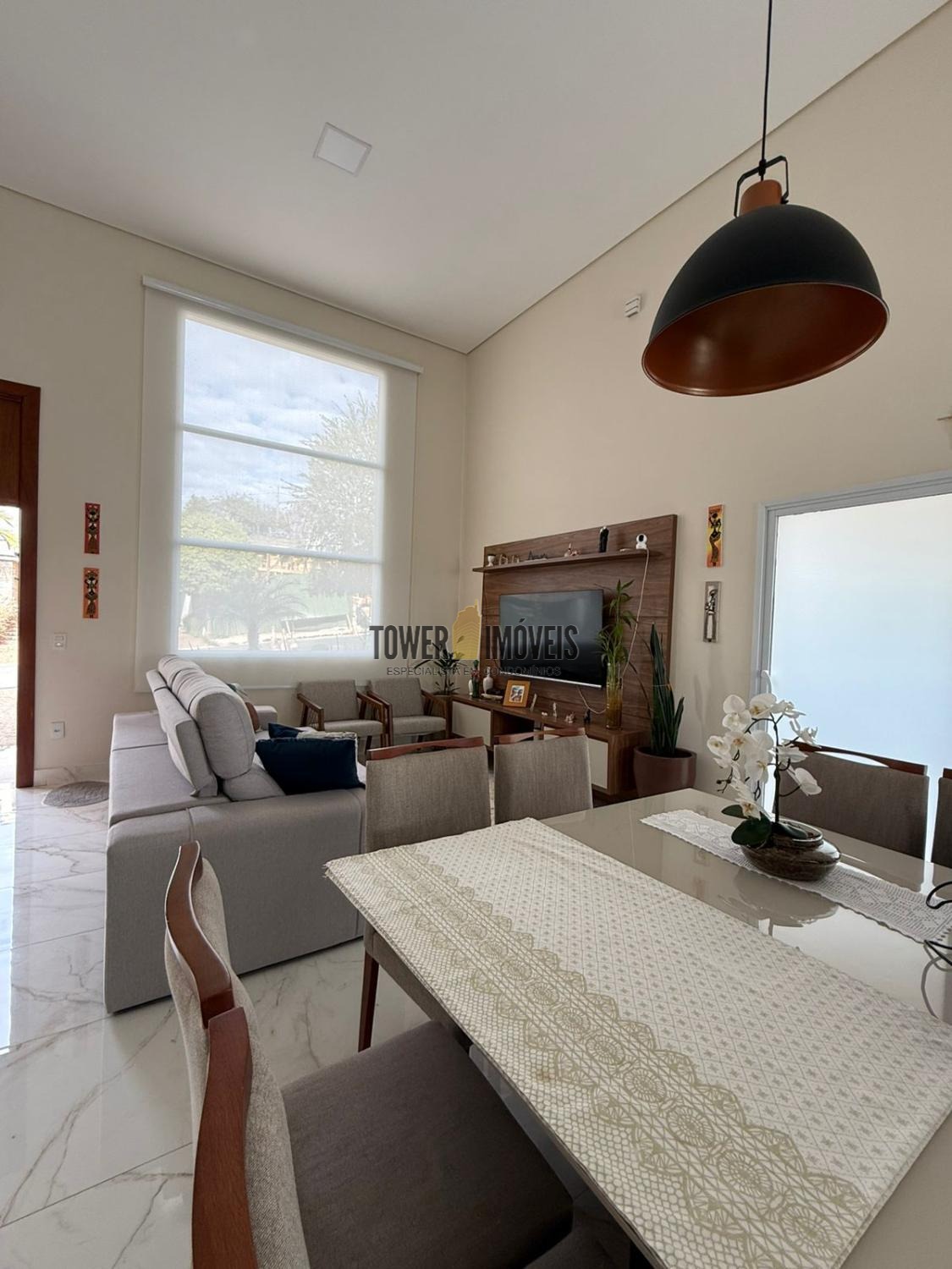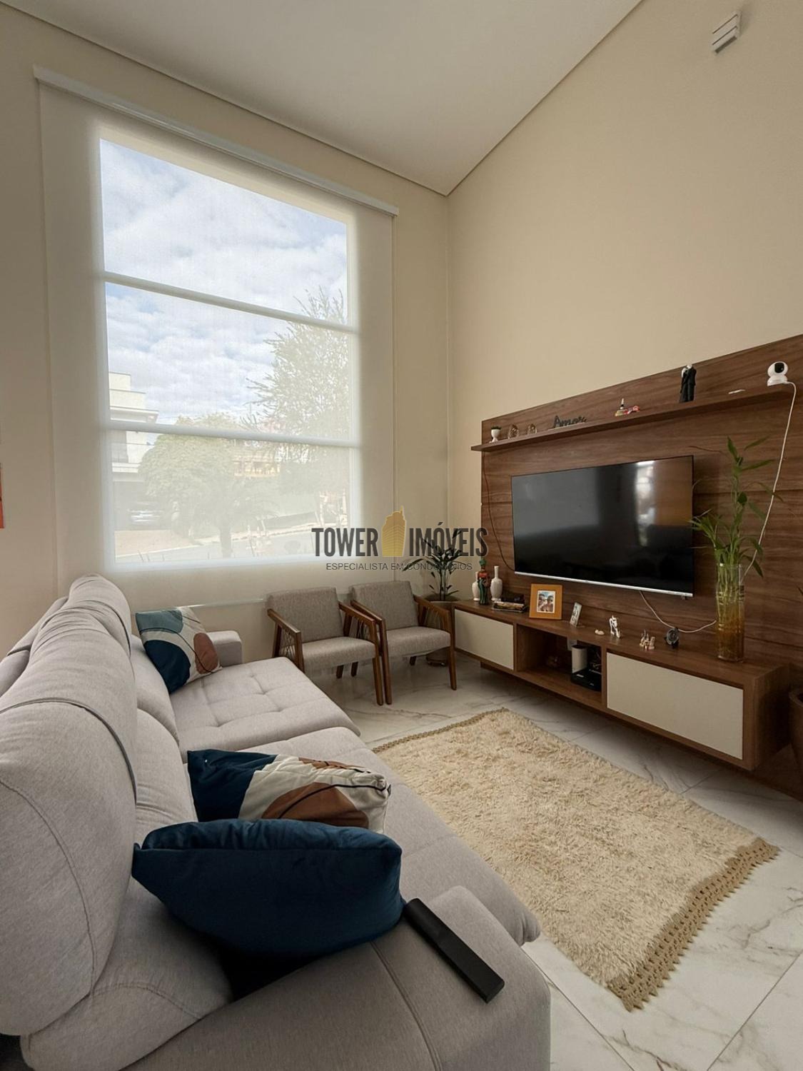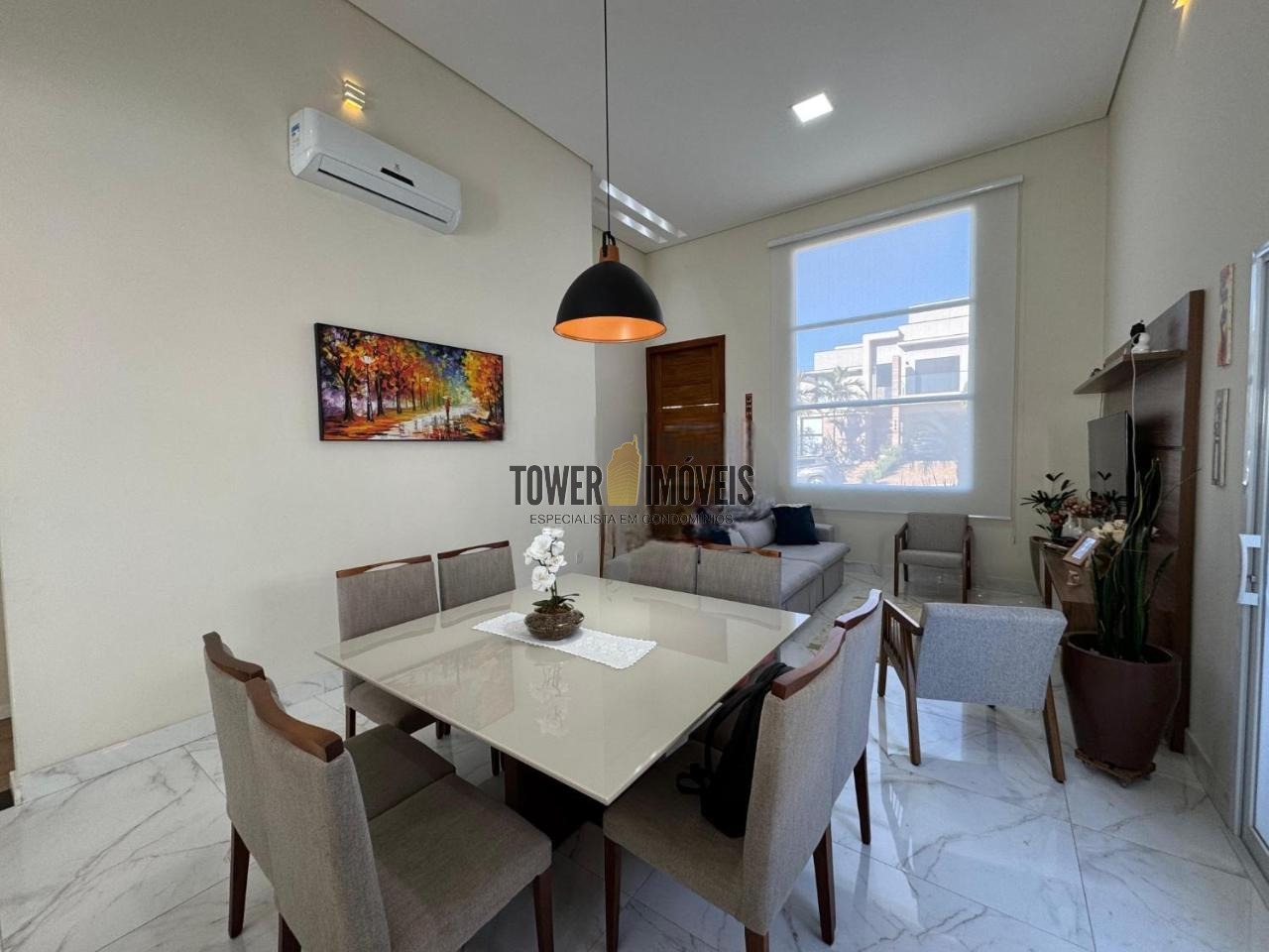 Possui sala de estar com painel de TV e pé direito alto, sala de jantar, cozinha americana com armários embutidos, despensa, lavanderia, 3 quartos com armários planejados, sendo 2 suítes (uma suíte com closet e sacada), banheiro social com box e armários.