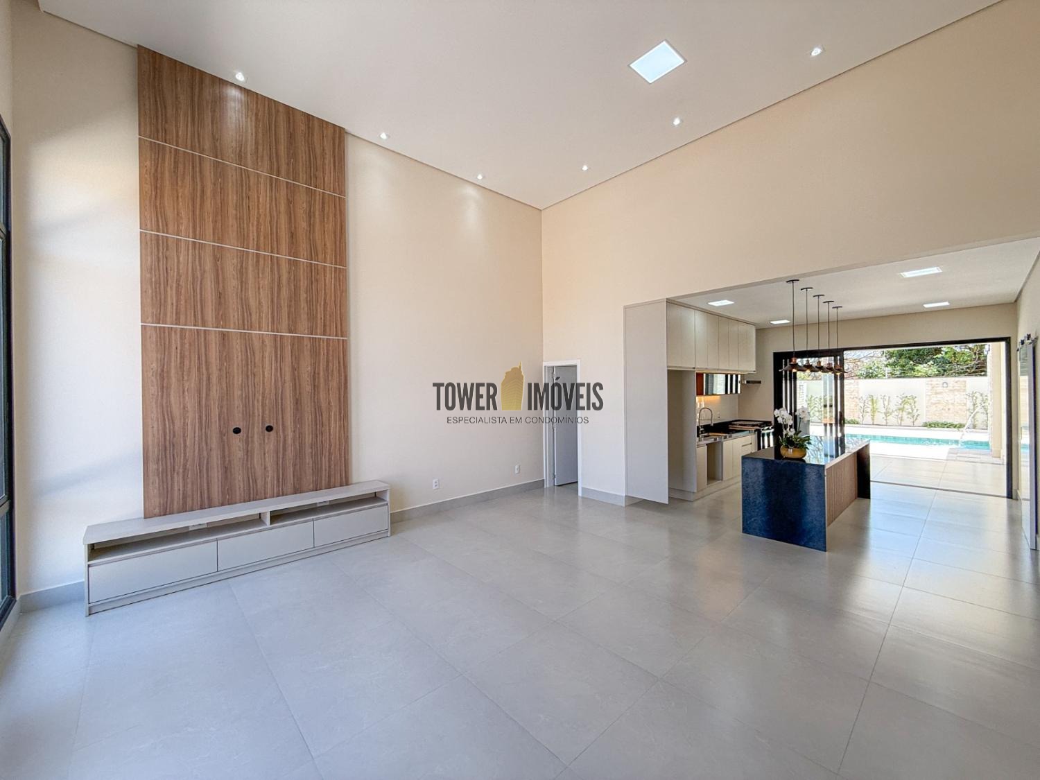 Living integrado com pé direito alto e luz natural