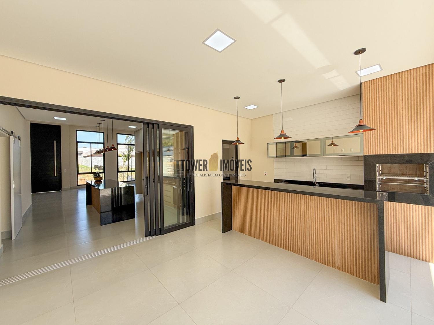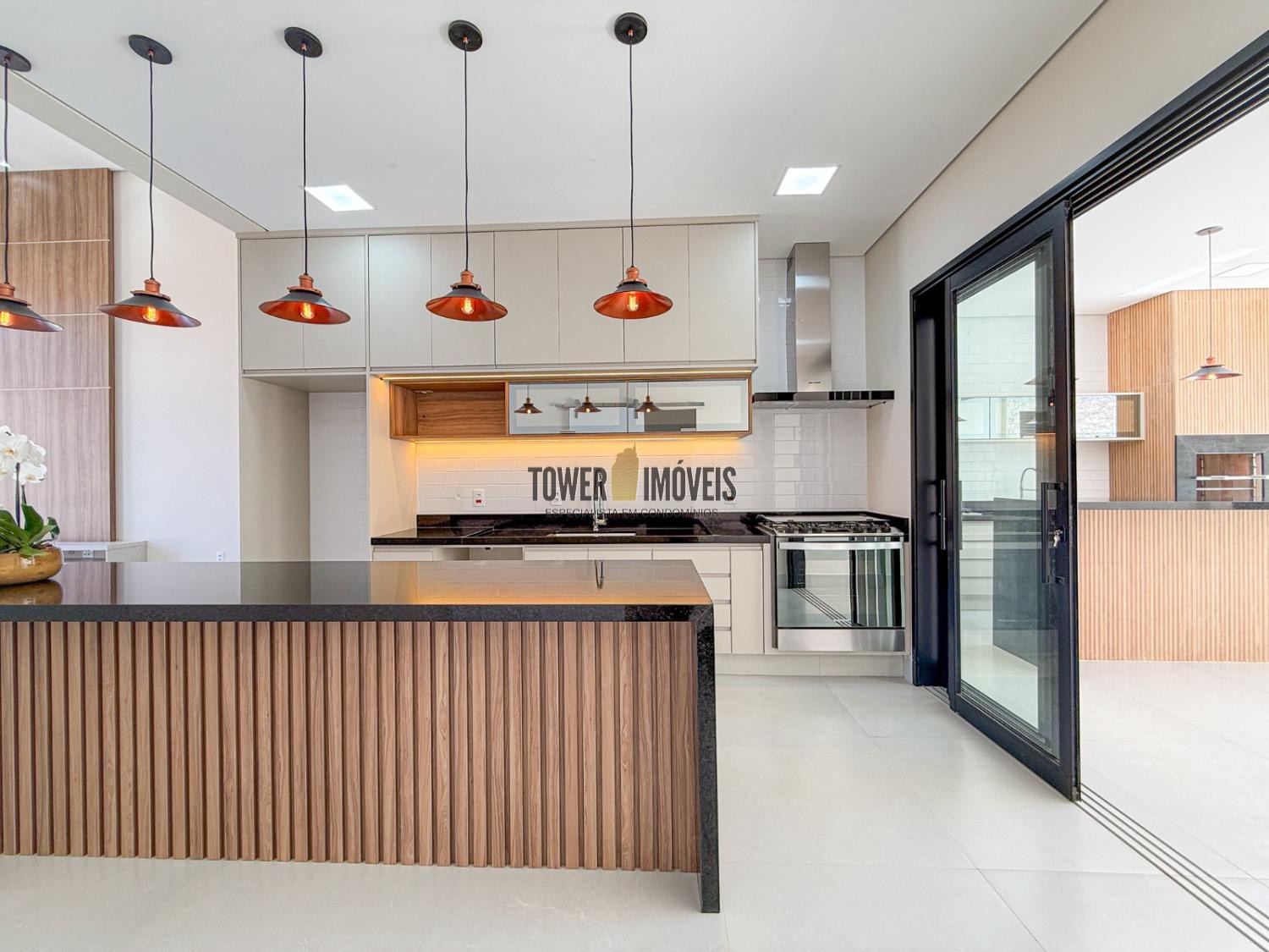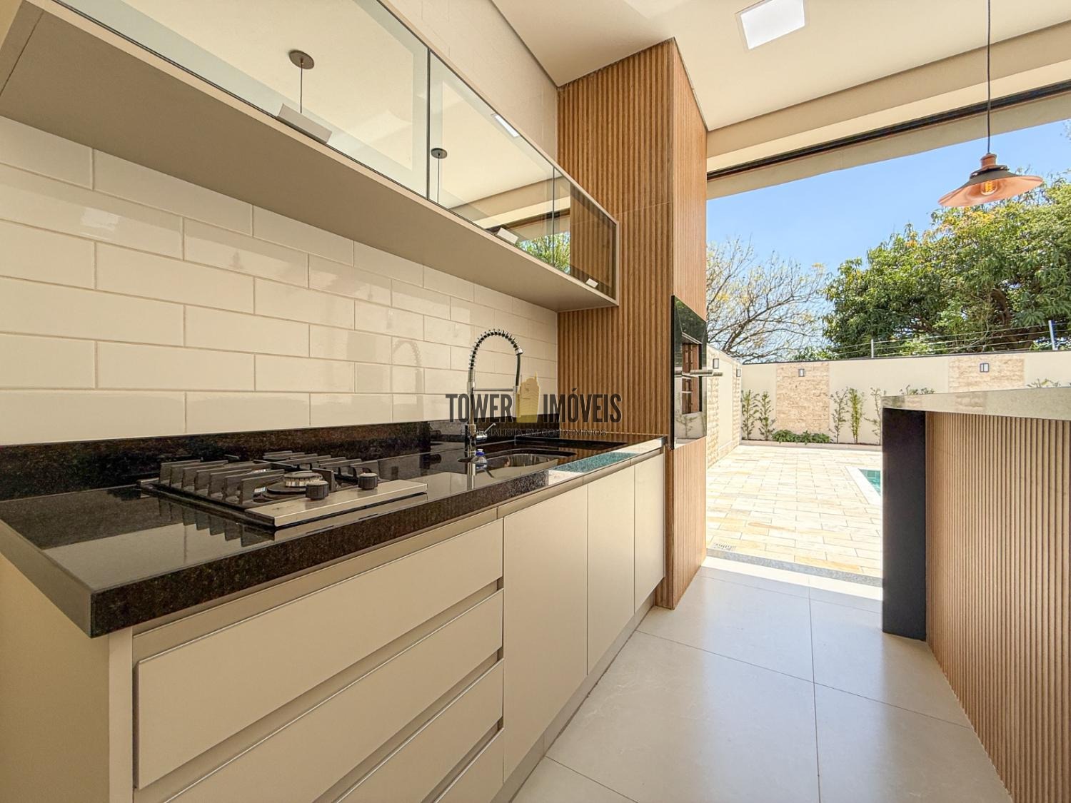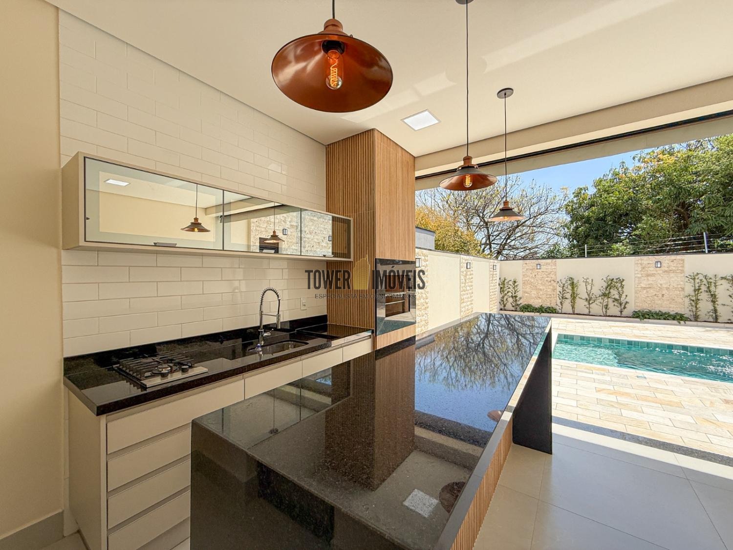 Área gourmet completa, churrasqueira, cooktop e vista incrível