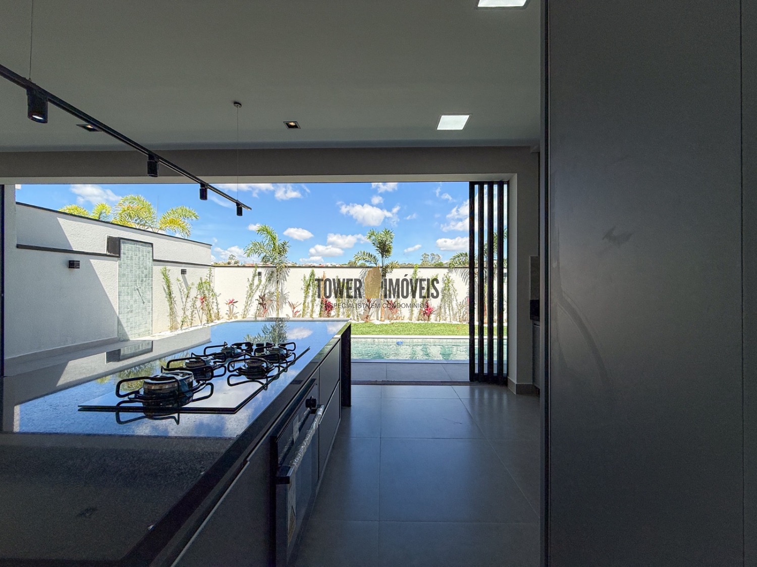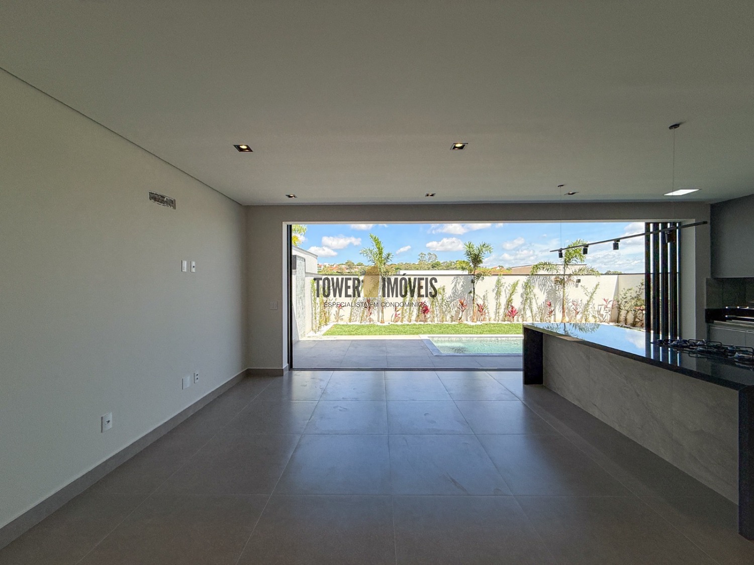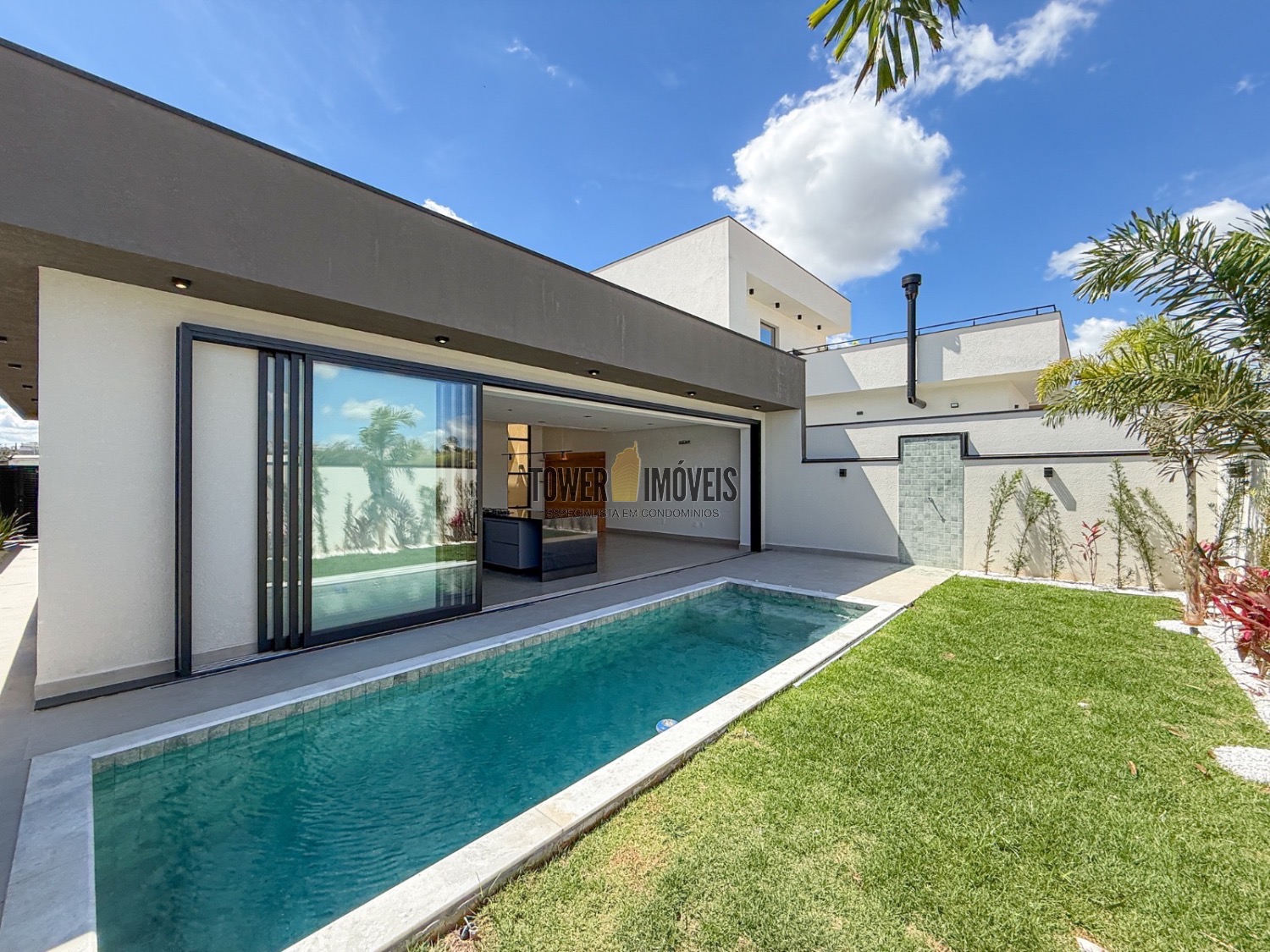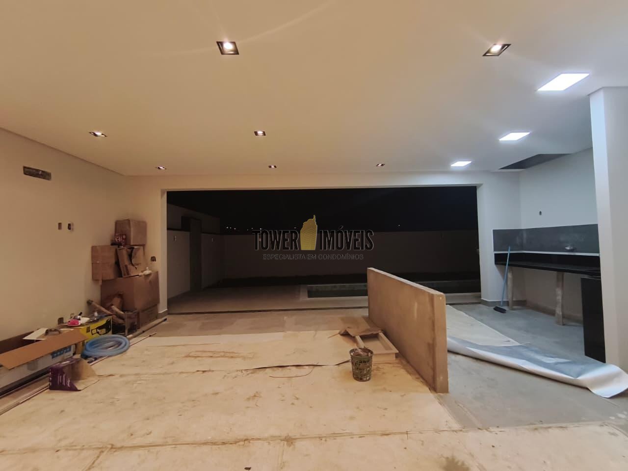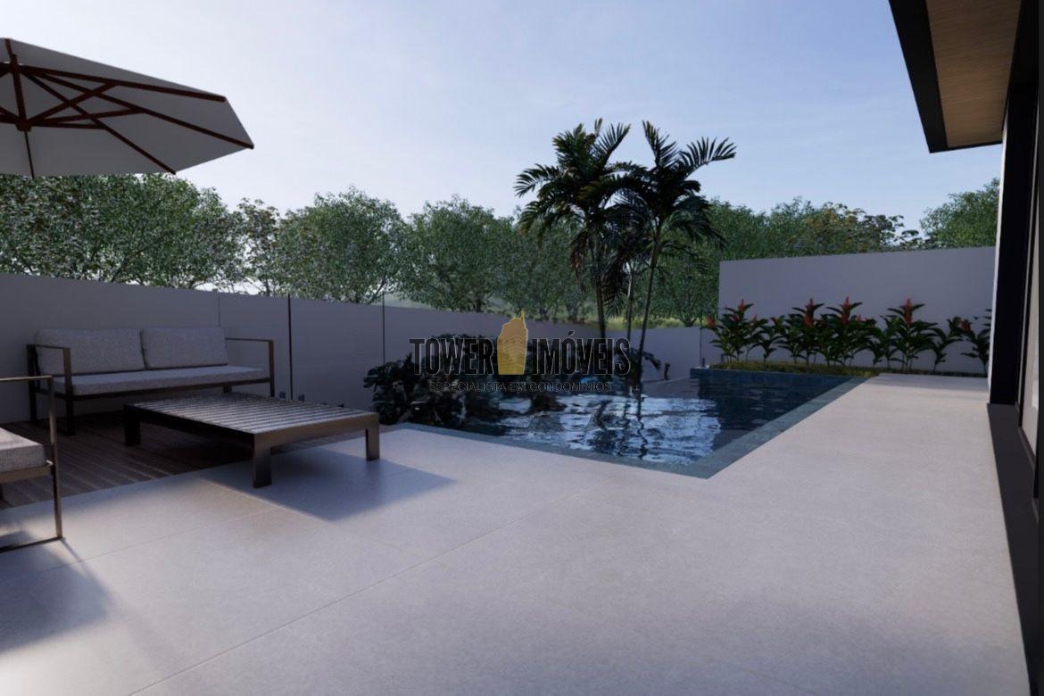 Sala living para dois ambientes, lavabo, cozinha, área gourmet com churrasqueira e quintal com piscina.