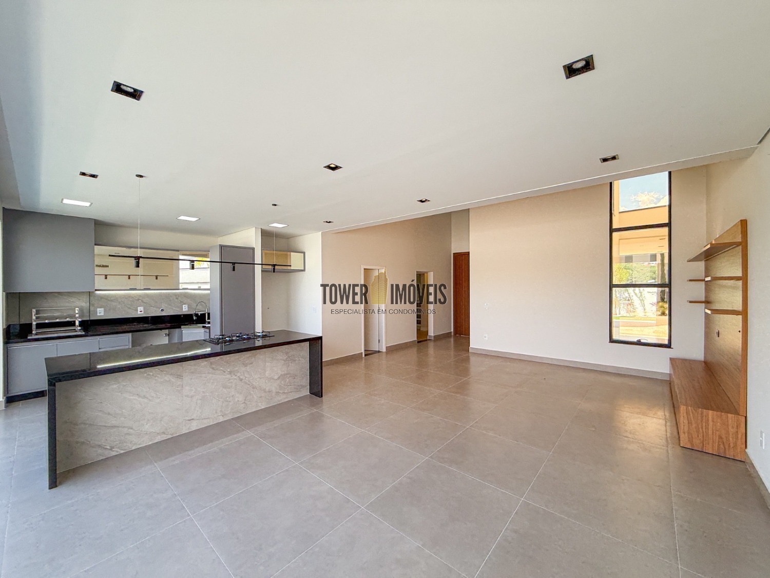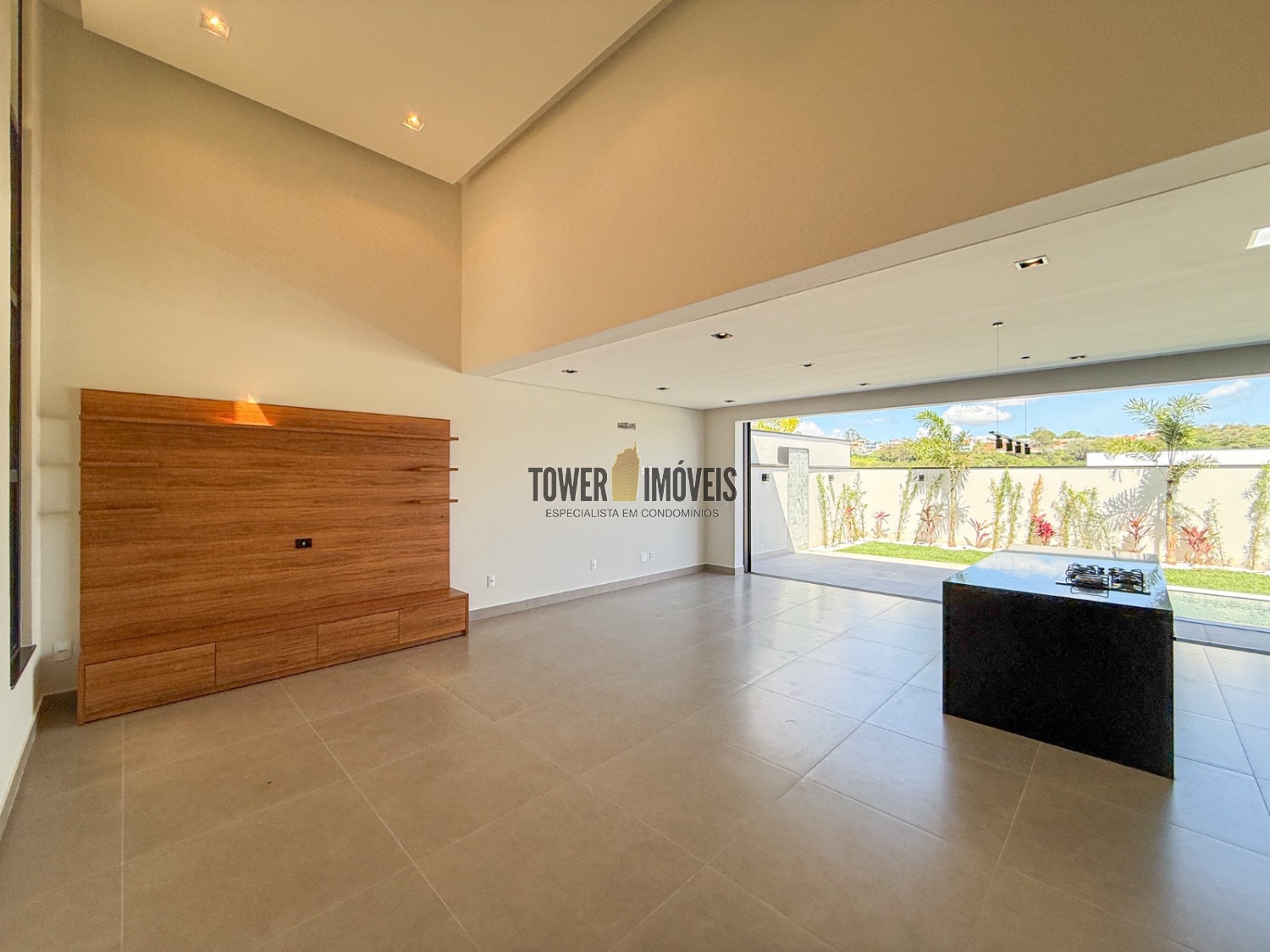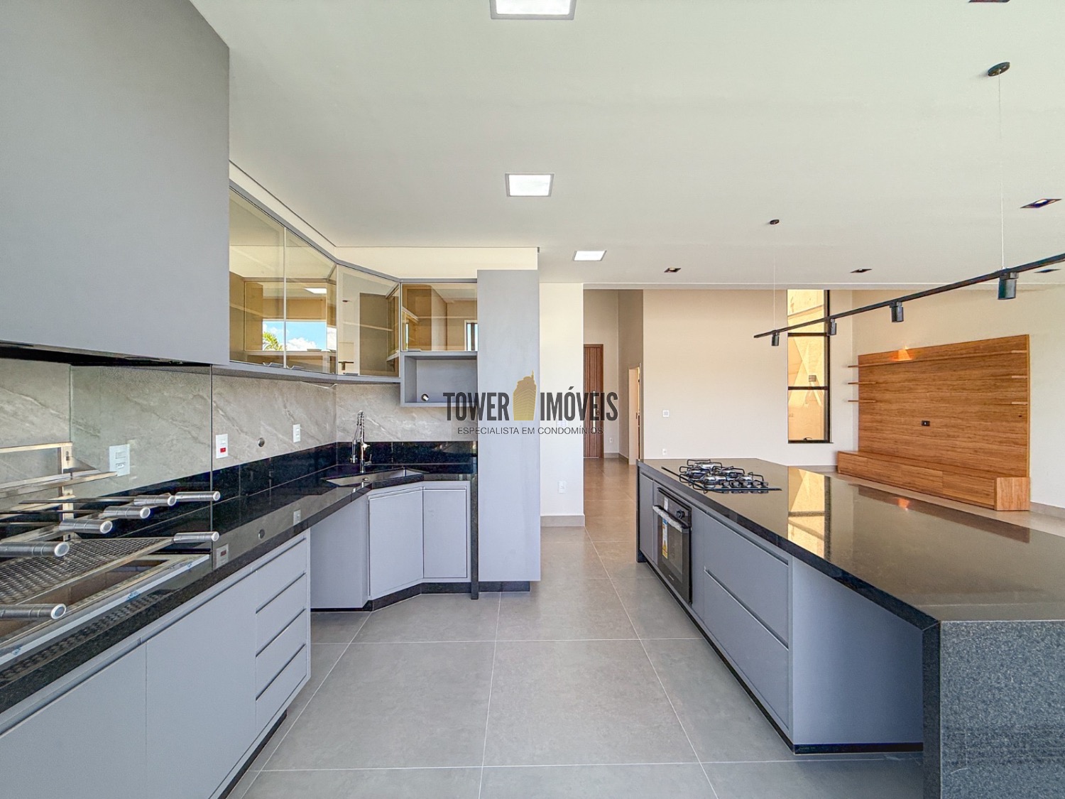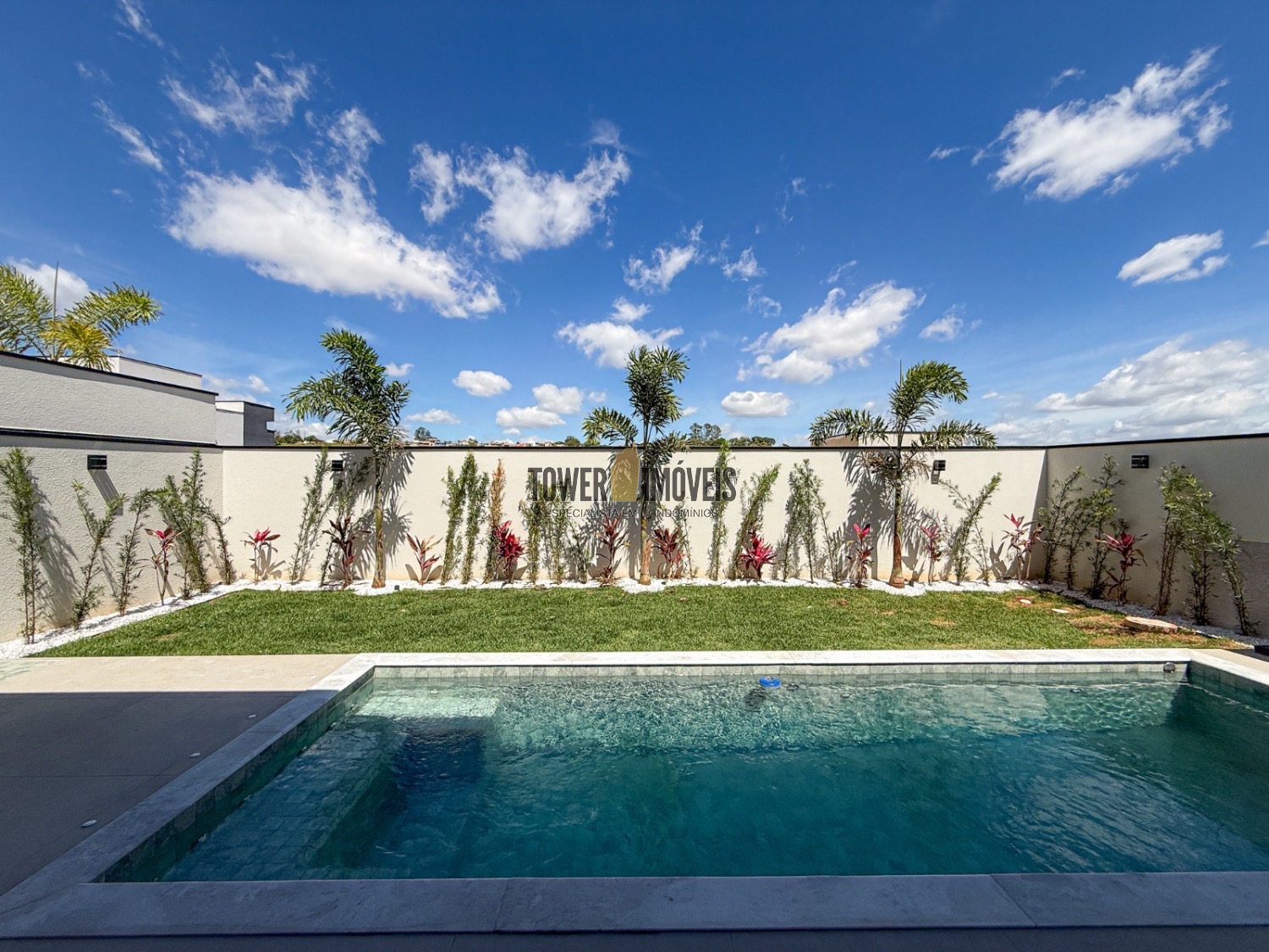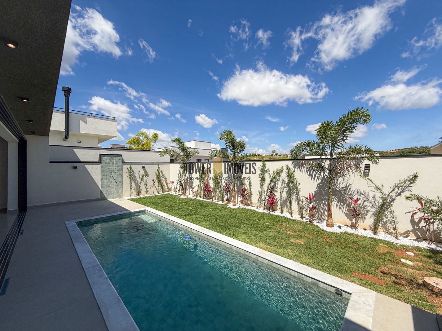 Sala living para dois ambientes, lavabo, cozinha, área gourmet com churrasqueira e quintal com piscina.