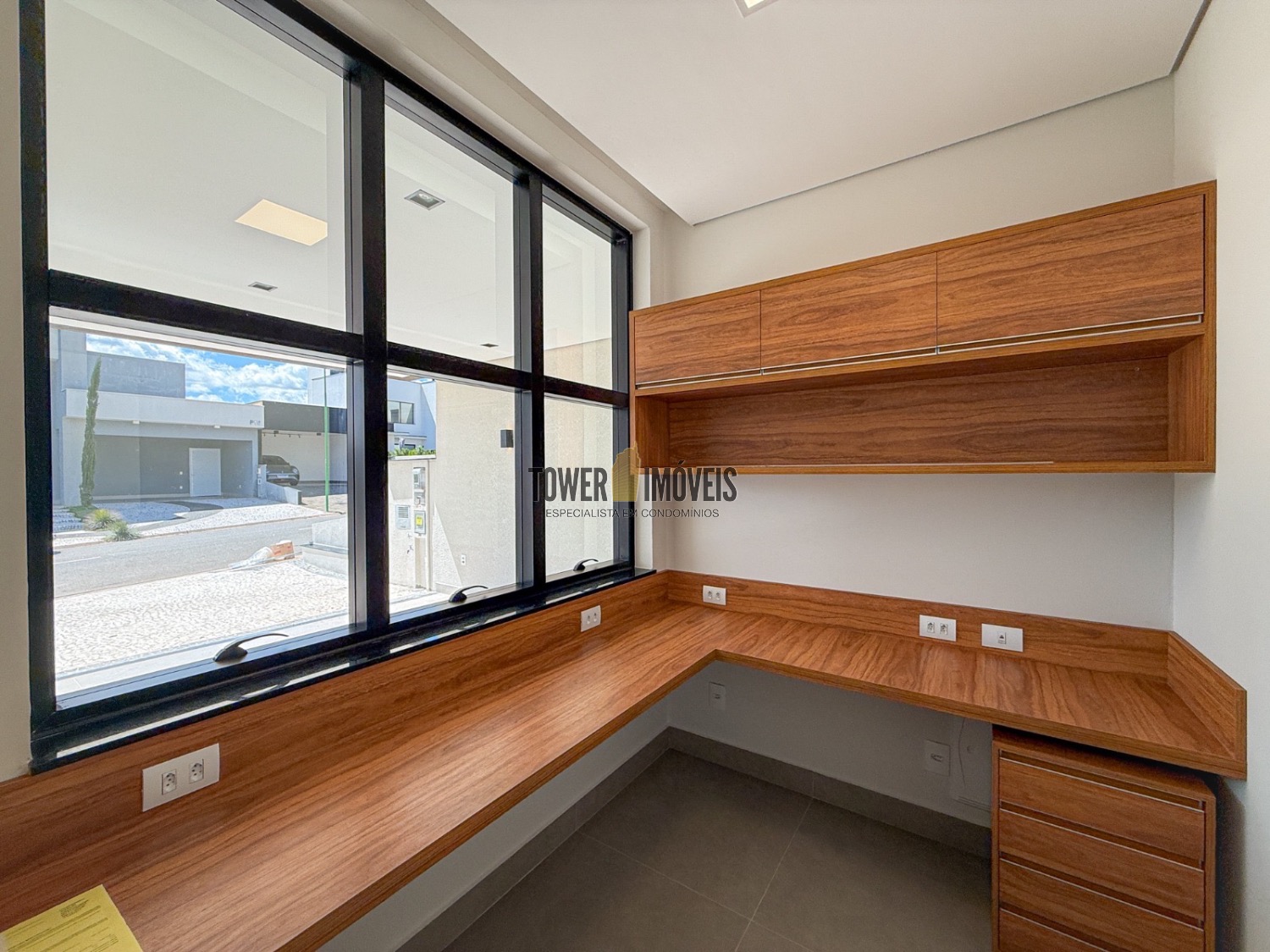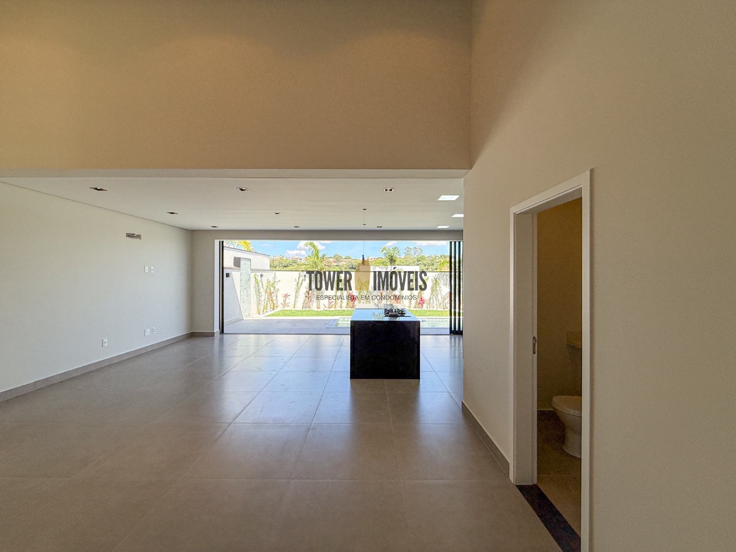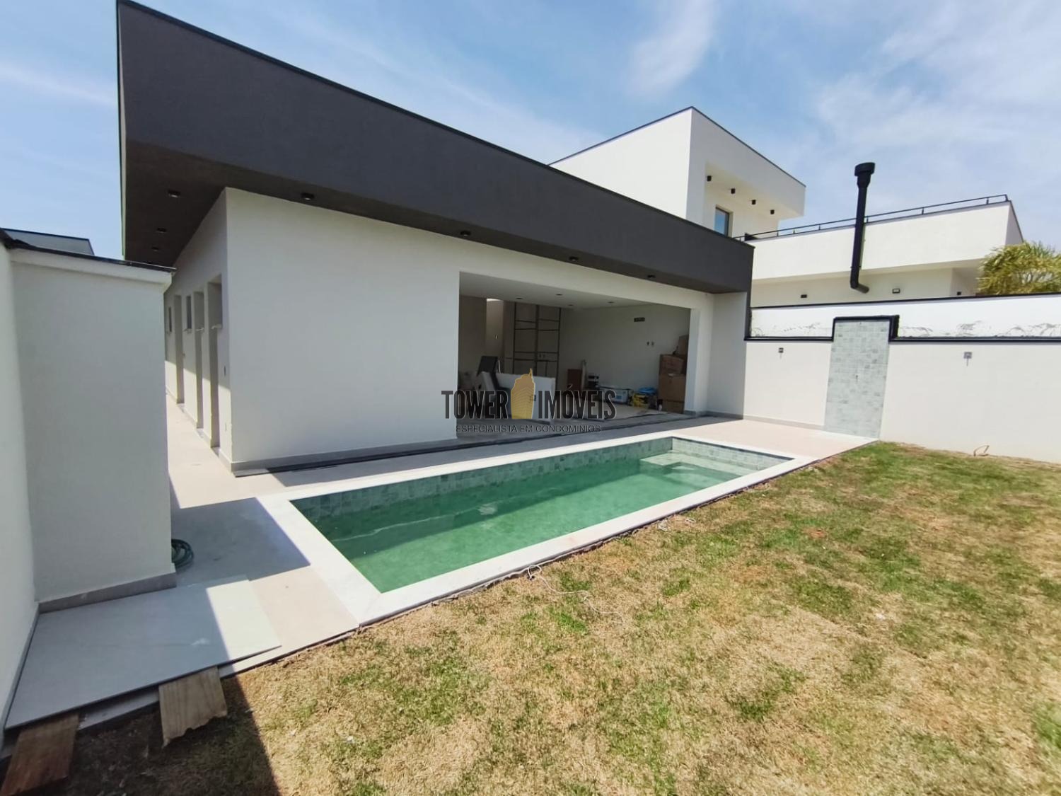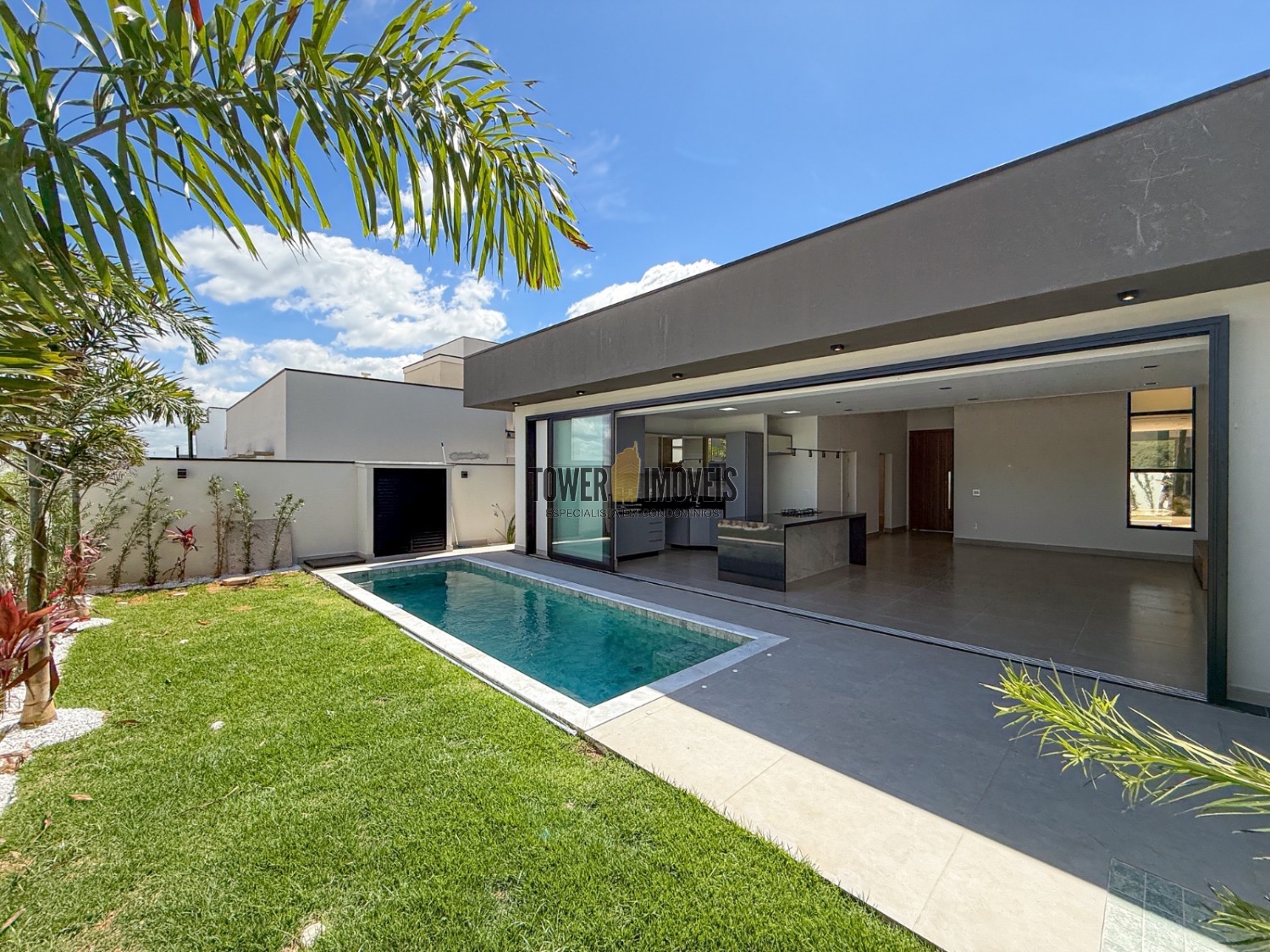 Casa completamente térrea já na entrada escritório e a vista do quintal e da piscina.