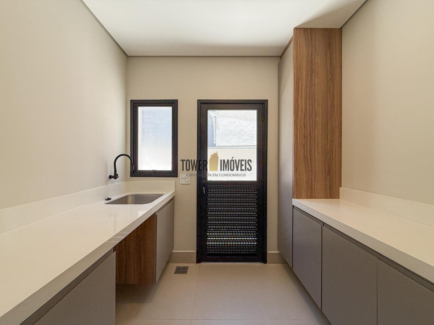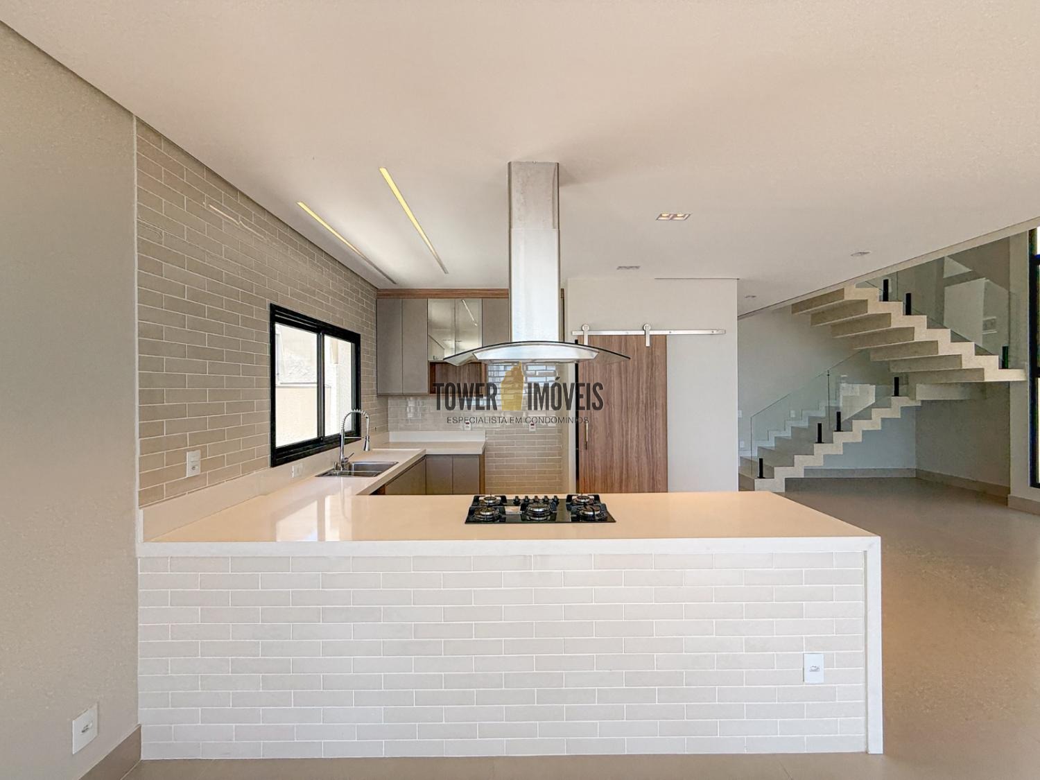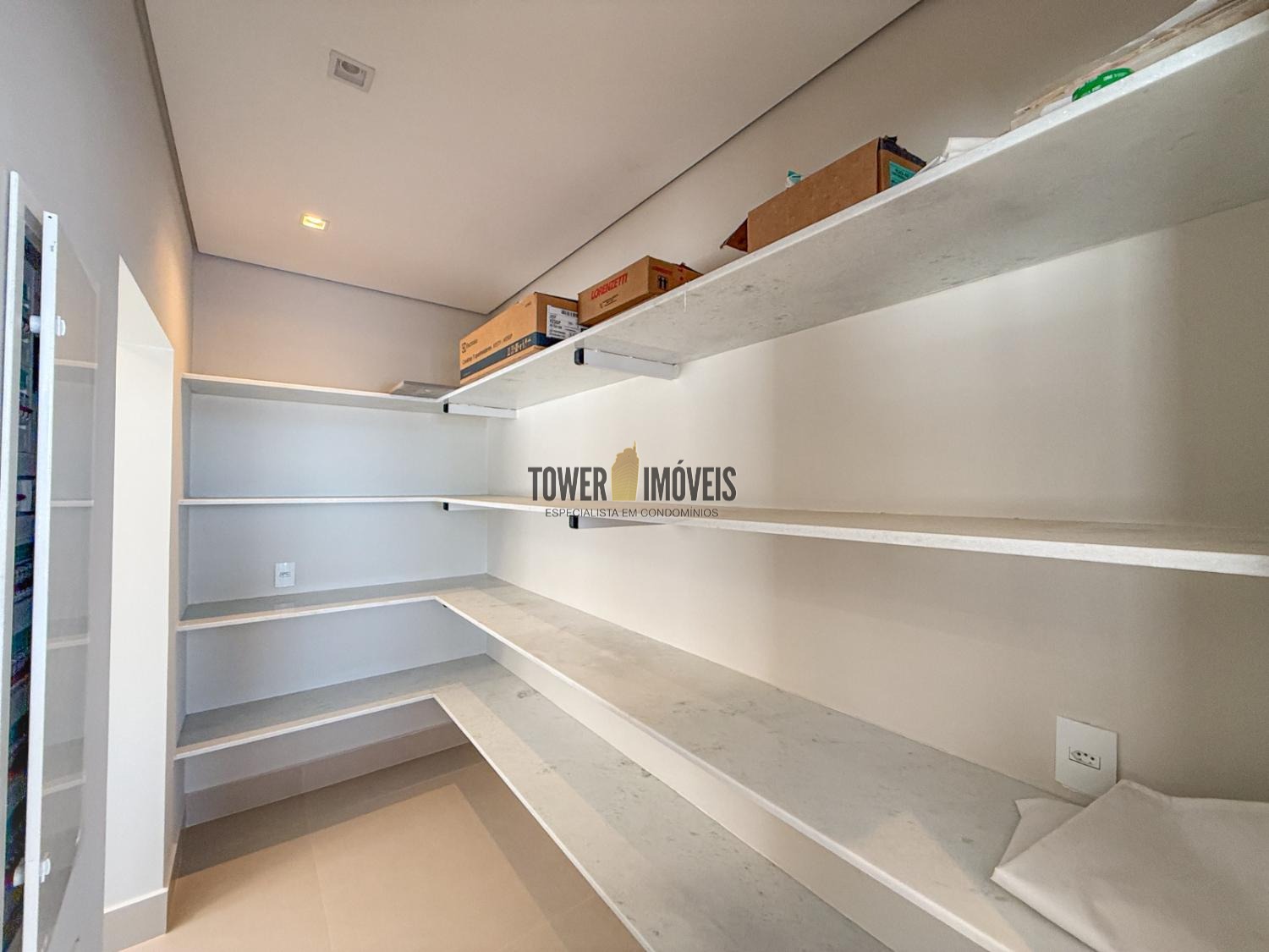 - Cozinha planejada com cooktop e coifa intalados, despensa com prateleiras em quartzo branco