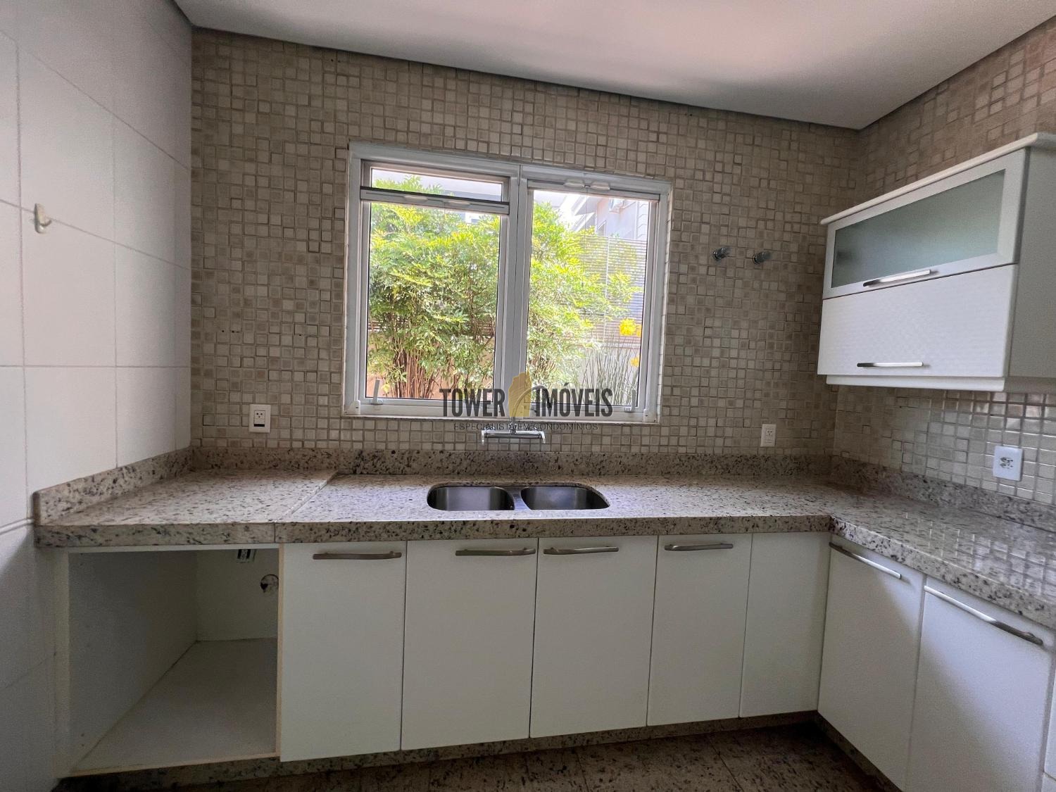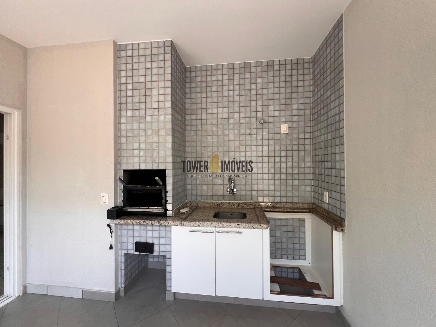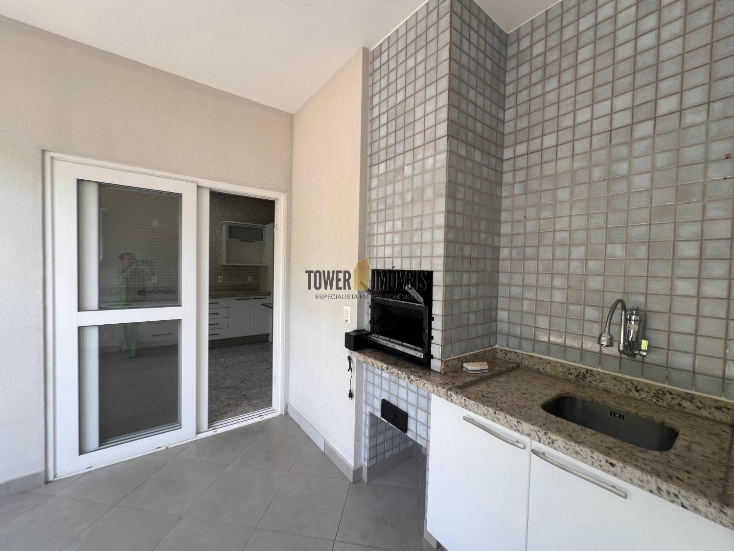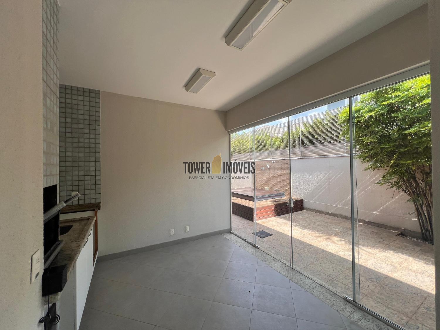 Cozinha planejada e ao lado espaço gourmet com ofurô e quintal.