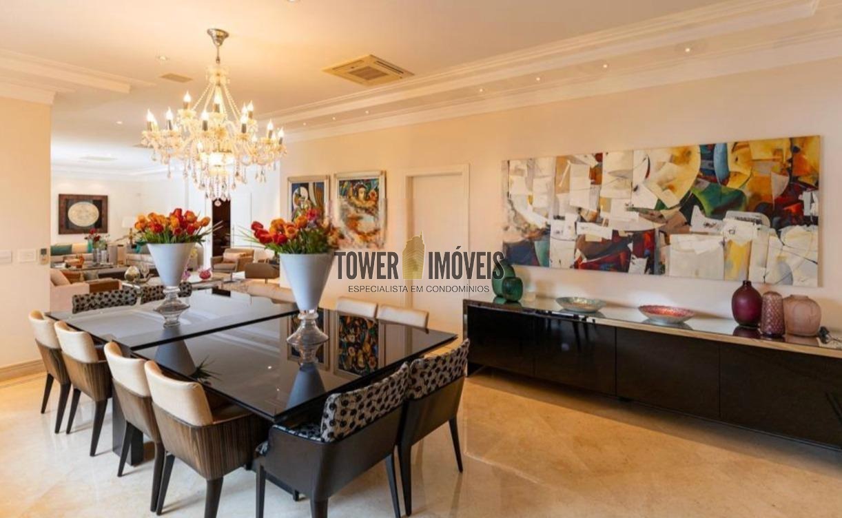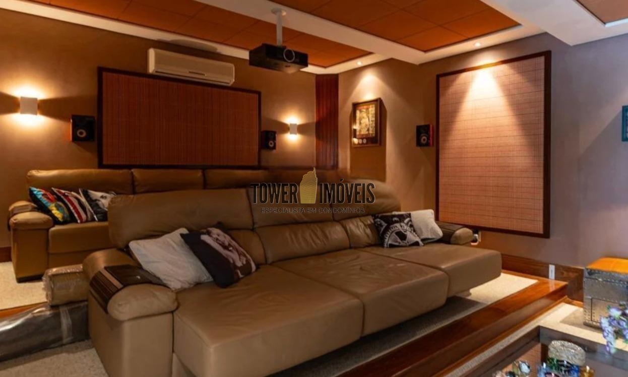 Os acabamentos elevam ainda mais o padrão do imóvel, com pisos em mármore Luxor Egípcio e tábua corrida, além de armários planejados em diversos ambientes como cozinha, banheiros, closets, escritório, sala de cinema, corredores e área de serviço.