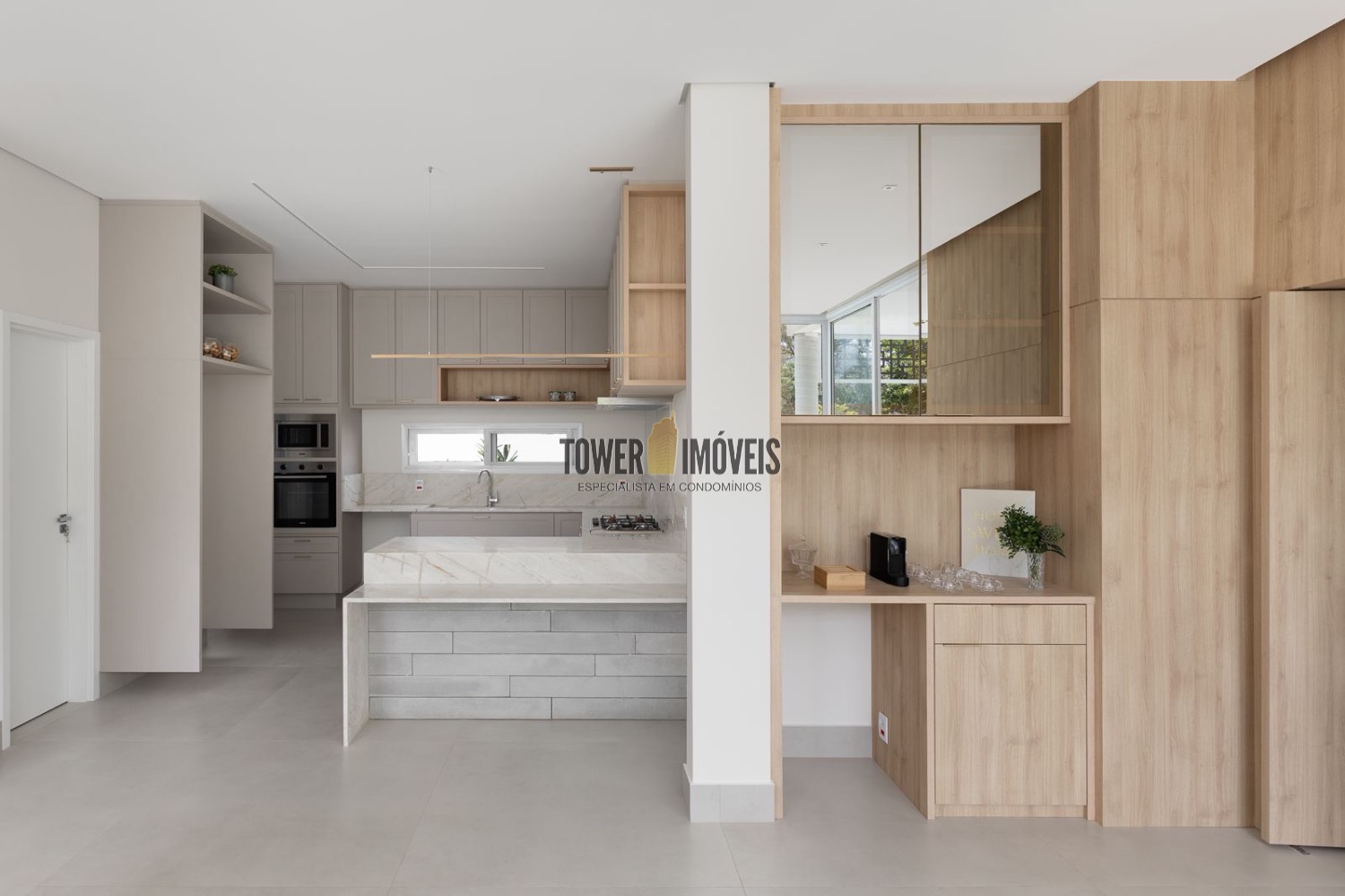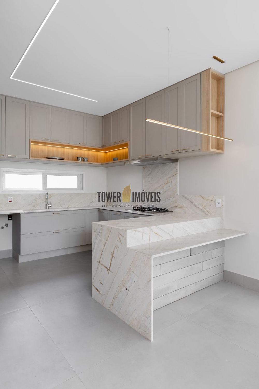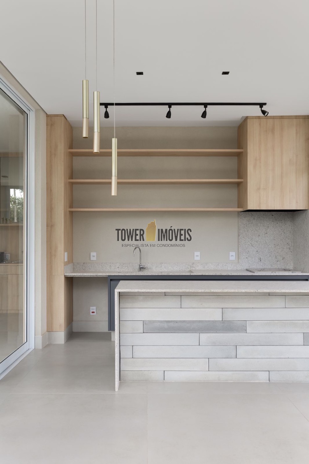 - Living amplo com cozinha americana e ilha + área gourmet com churrasqueira