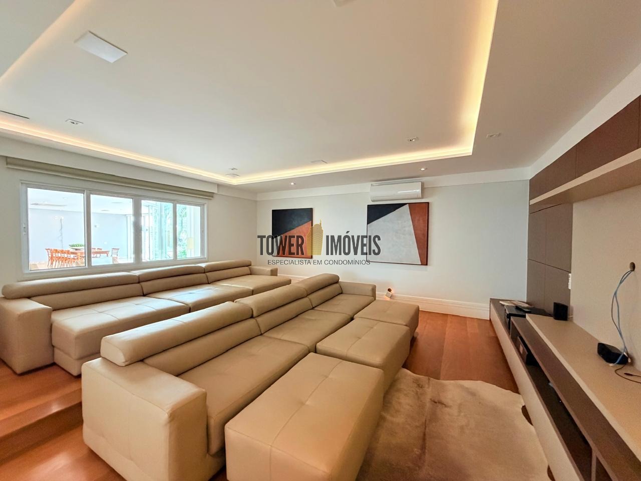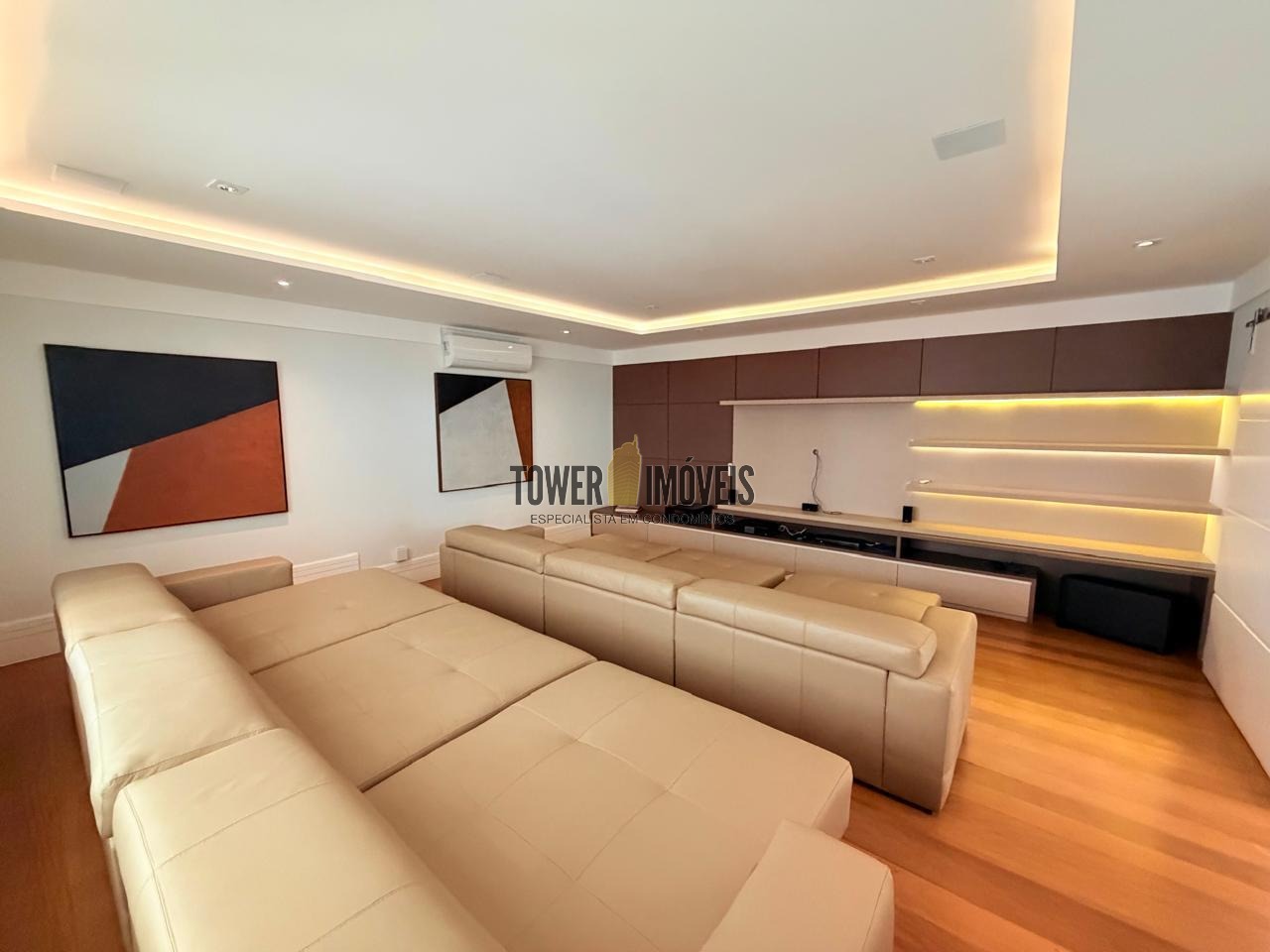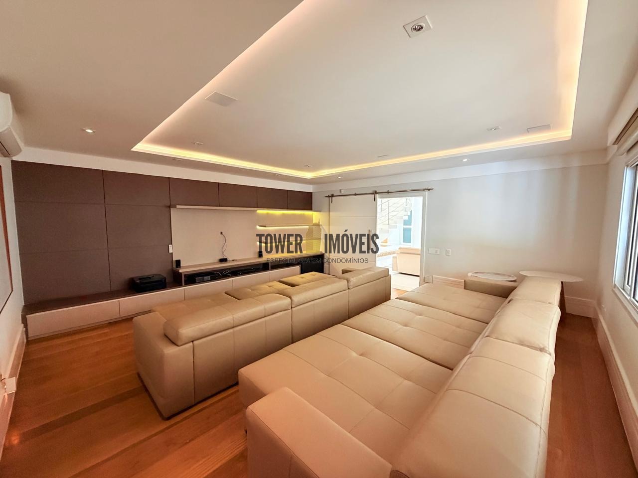 - Sala de cinema com sofá espaçoso e confortável, além de todo sistema de som