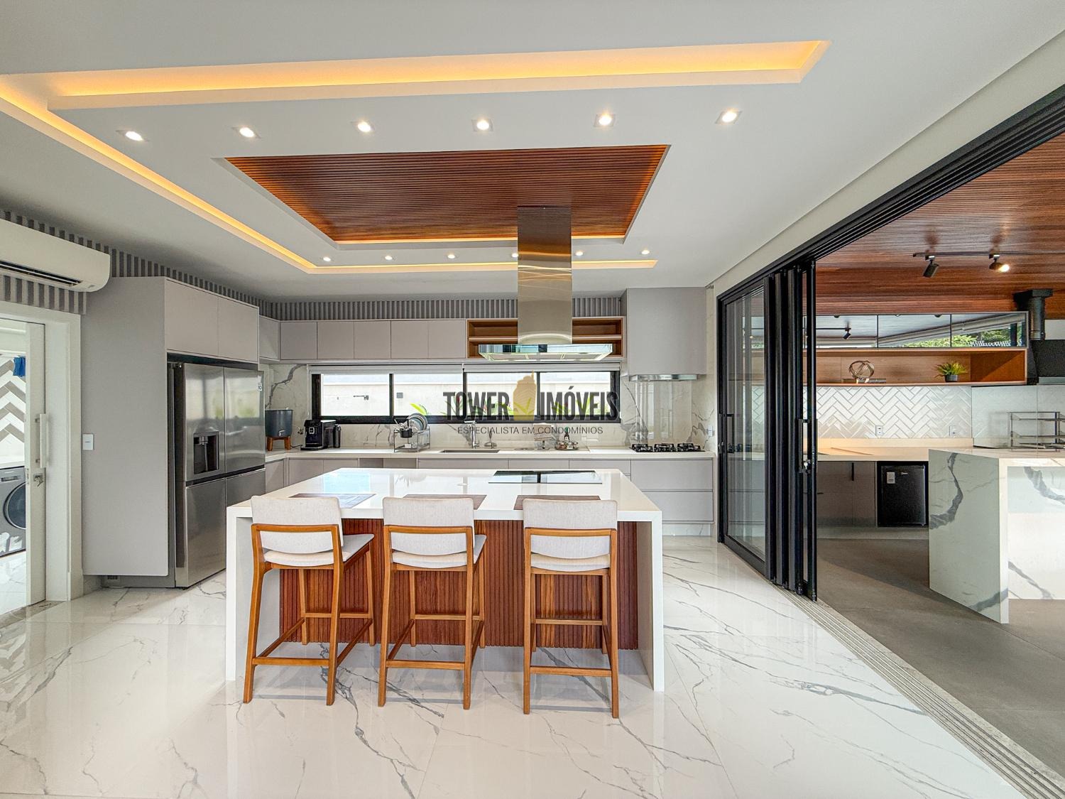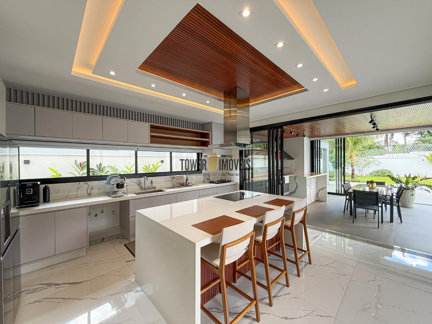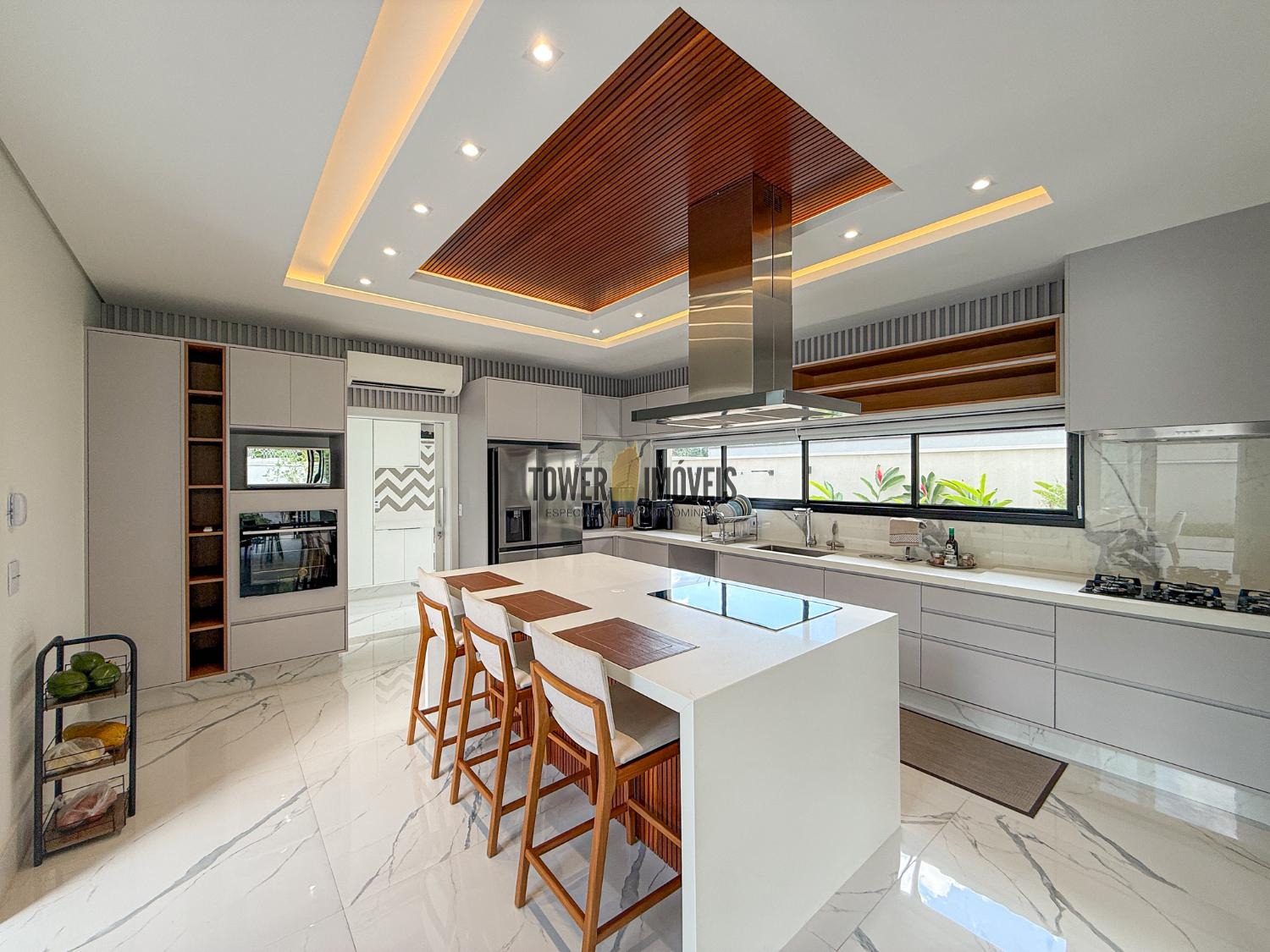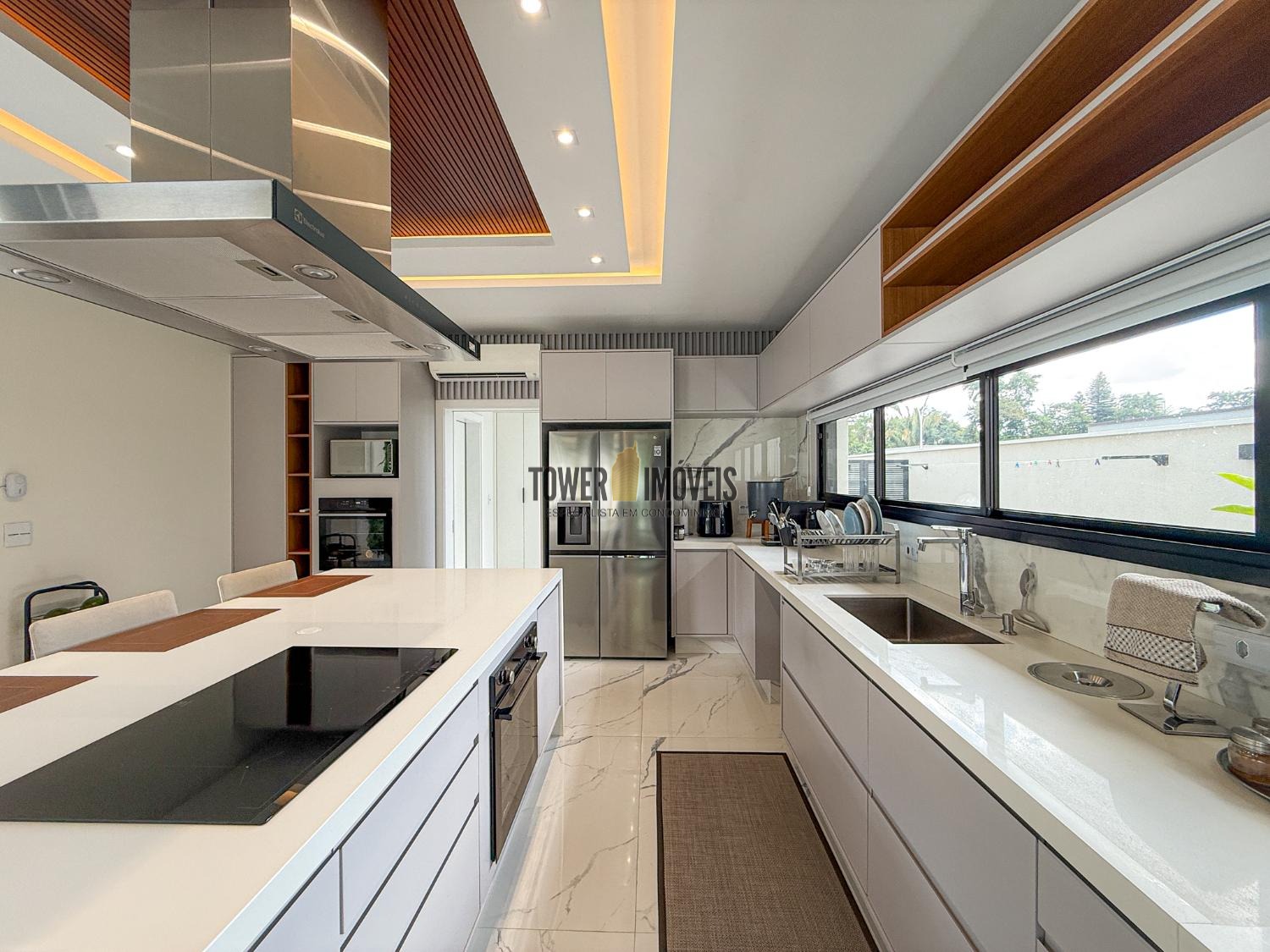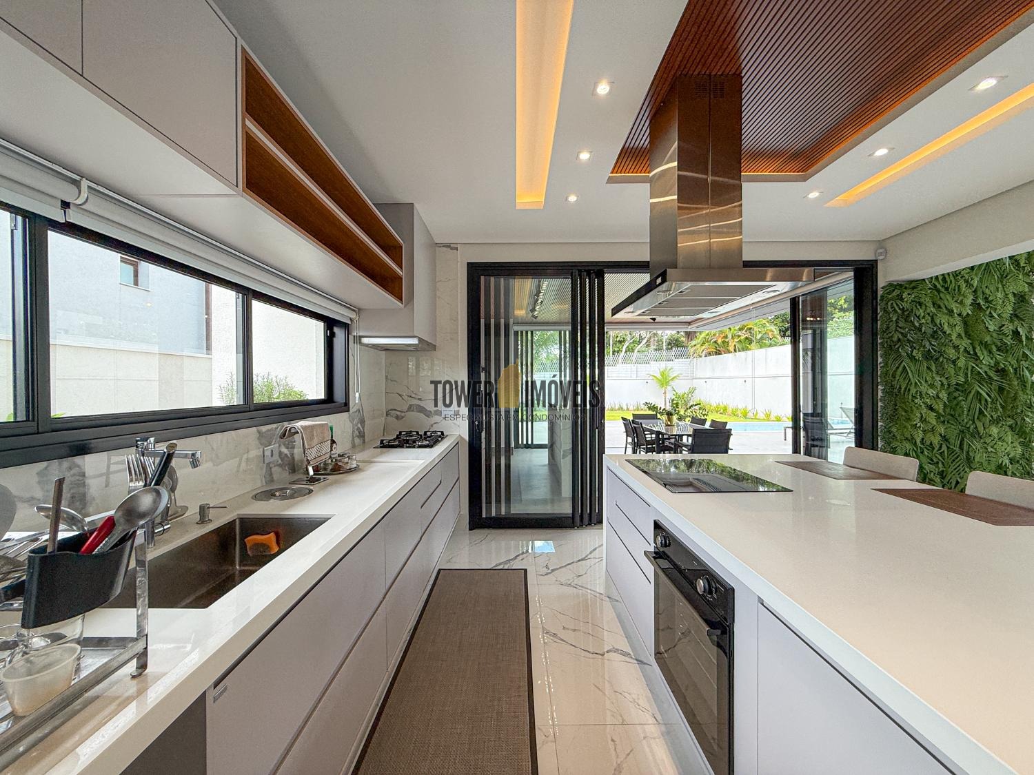 - Cozinha planejada com muitos armários, torre quente, cooktop, coifa e despensa