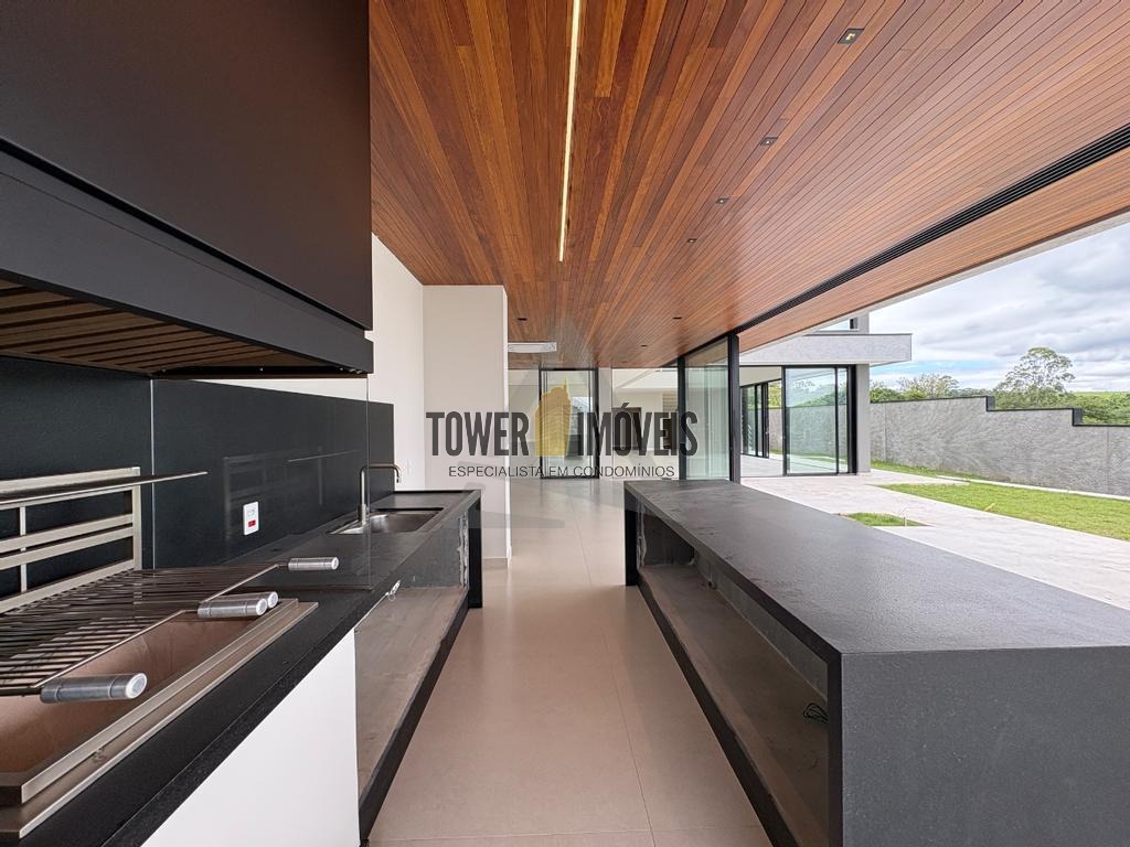 No piso inferior, os ambientes sociais impressionam pela amplitude e funcionalidade: sala de estar, sala de jantar, lavabo, home cinema, escritório e uma cozinha prática e bem planejada.