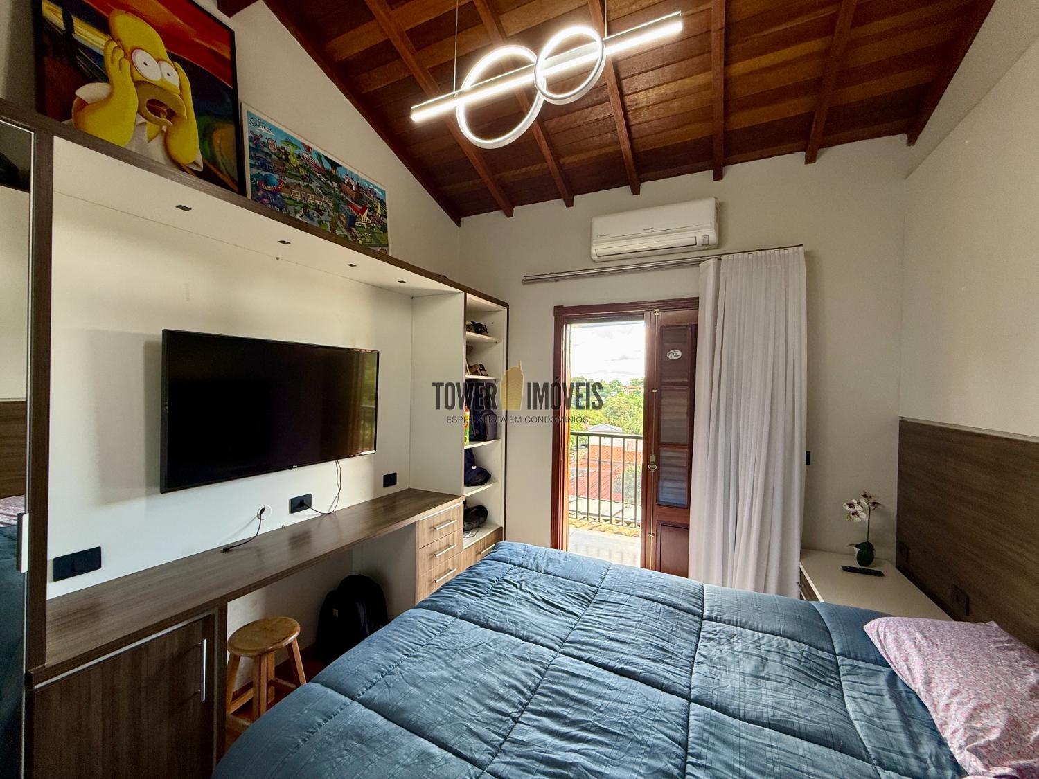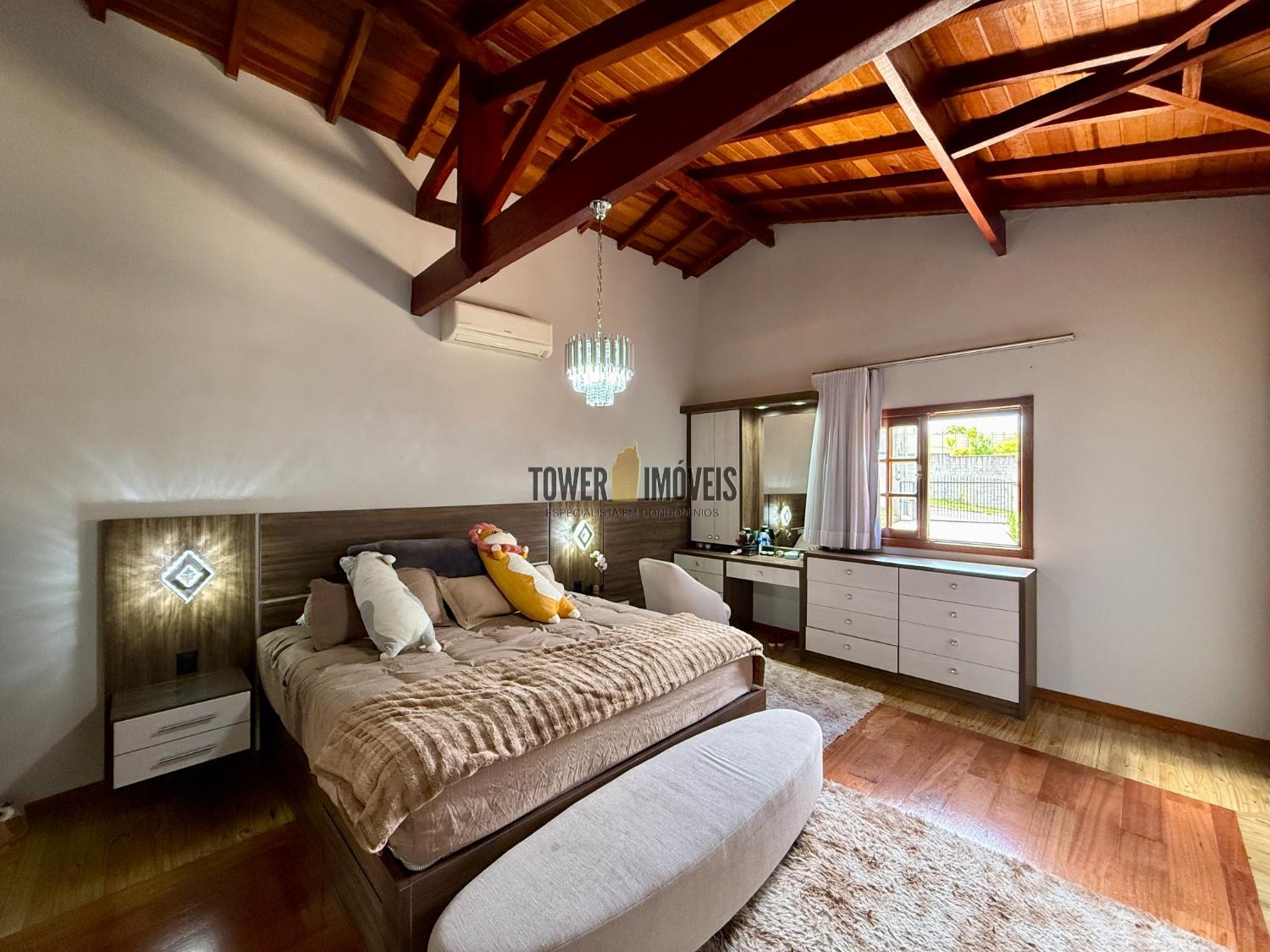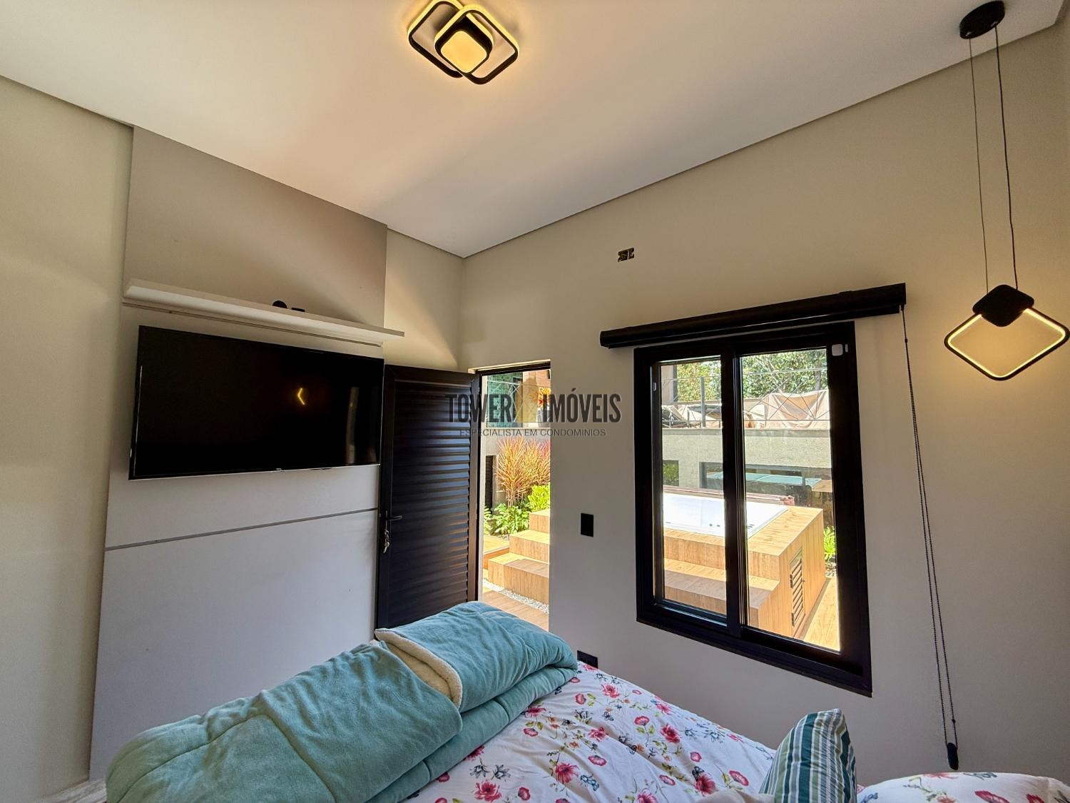 Piso Superior: A área íntima dispõe de 3 suítes sofisticadas. O destaque vai para a suíte máster com hidromassagem e vista panorâmica, além de uma suíte com closet e varanda. O andar conta ainda com um elegante espaço com fechamento em vidro.