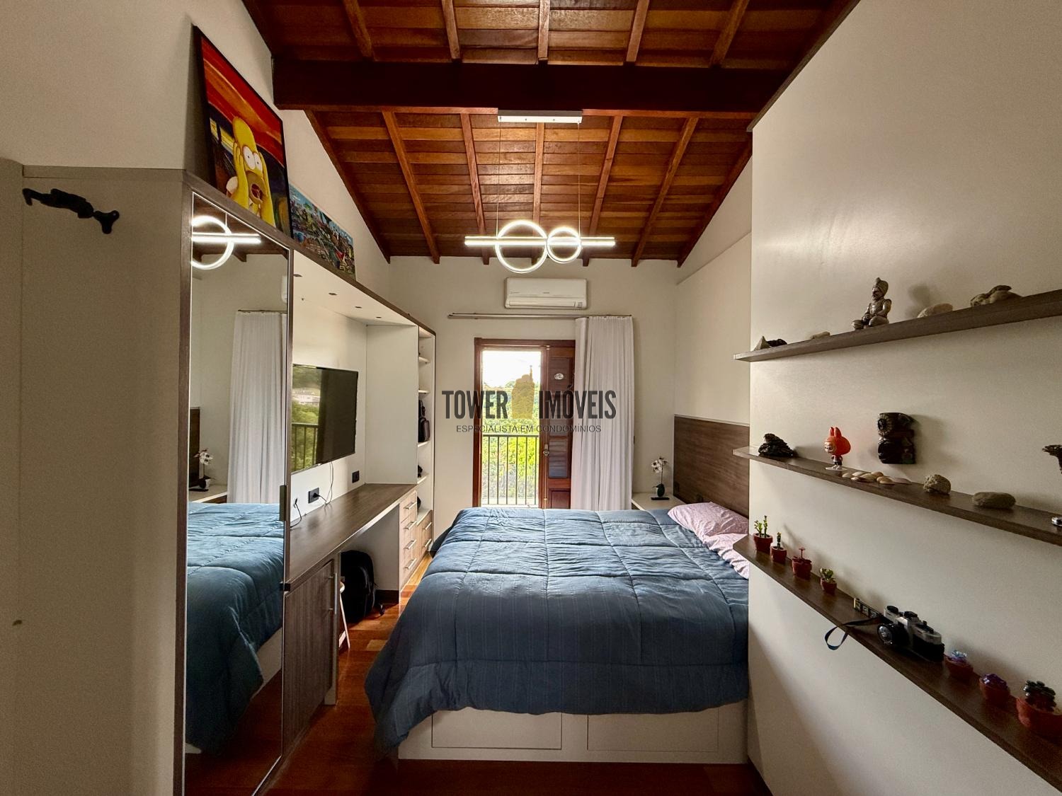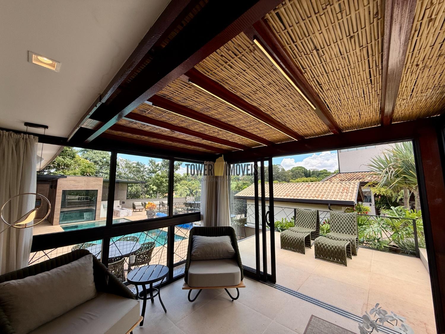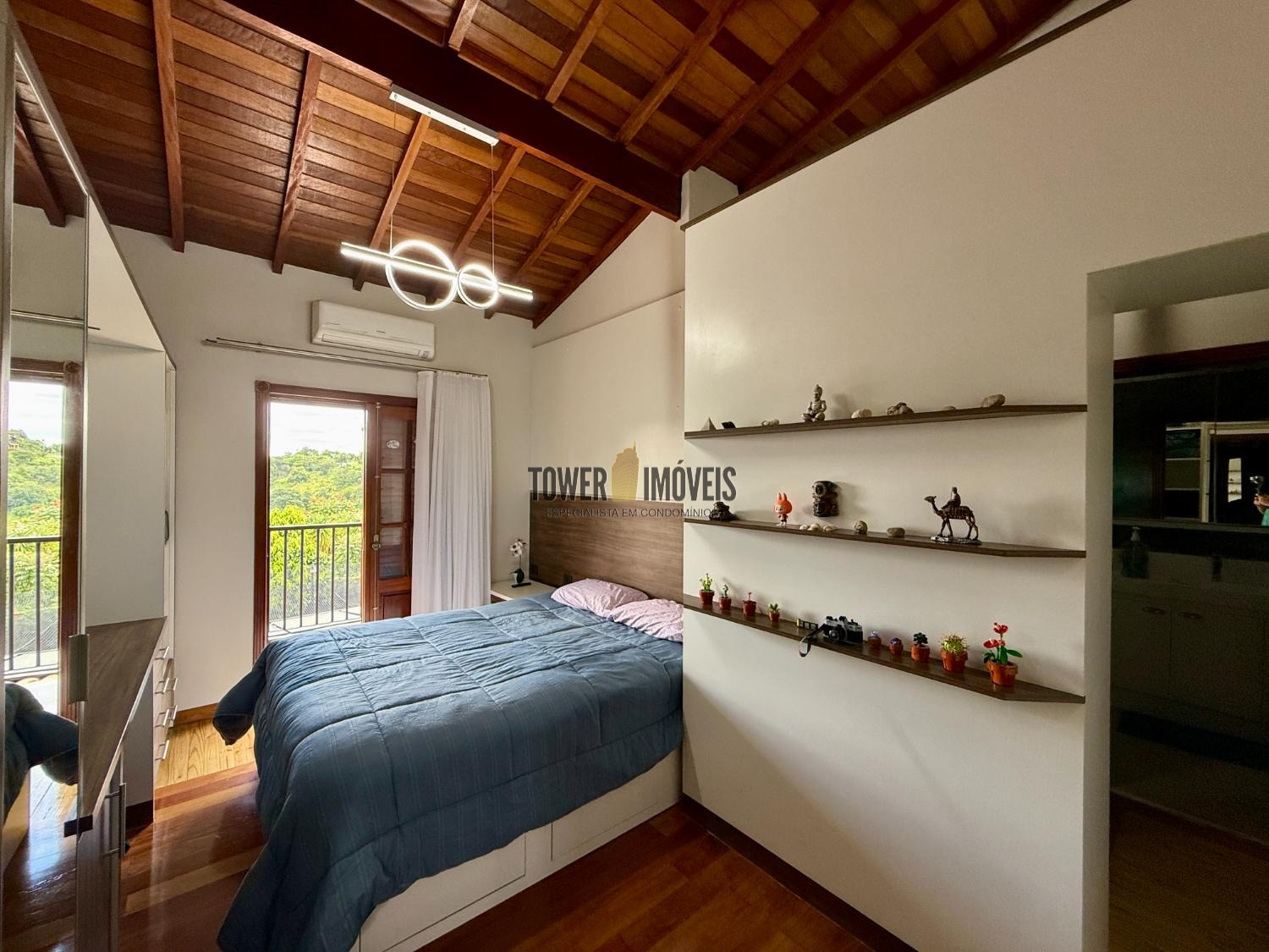Piso Superior: A área íntima dispõe de 3 suítes sofisticadas. O destaque vai para a suíte máster com hidromassagem e vista panorâmica, além de uma suíte com closet e varanda. O andar conta ainda com um elegante espaço com fechamento em vidro.