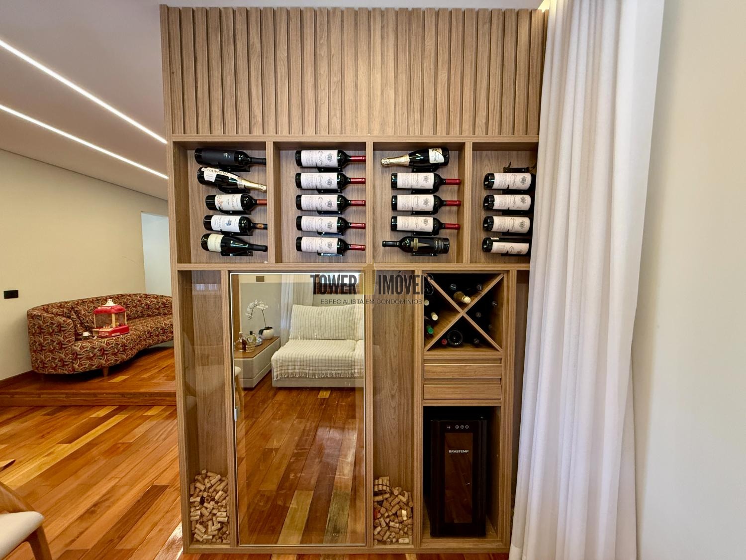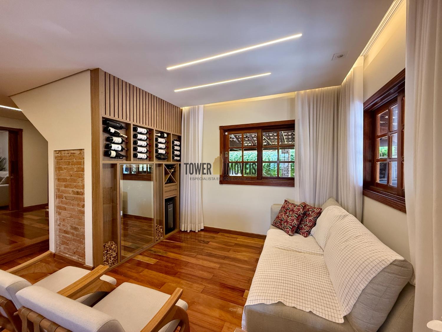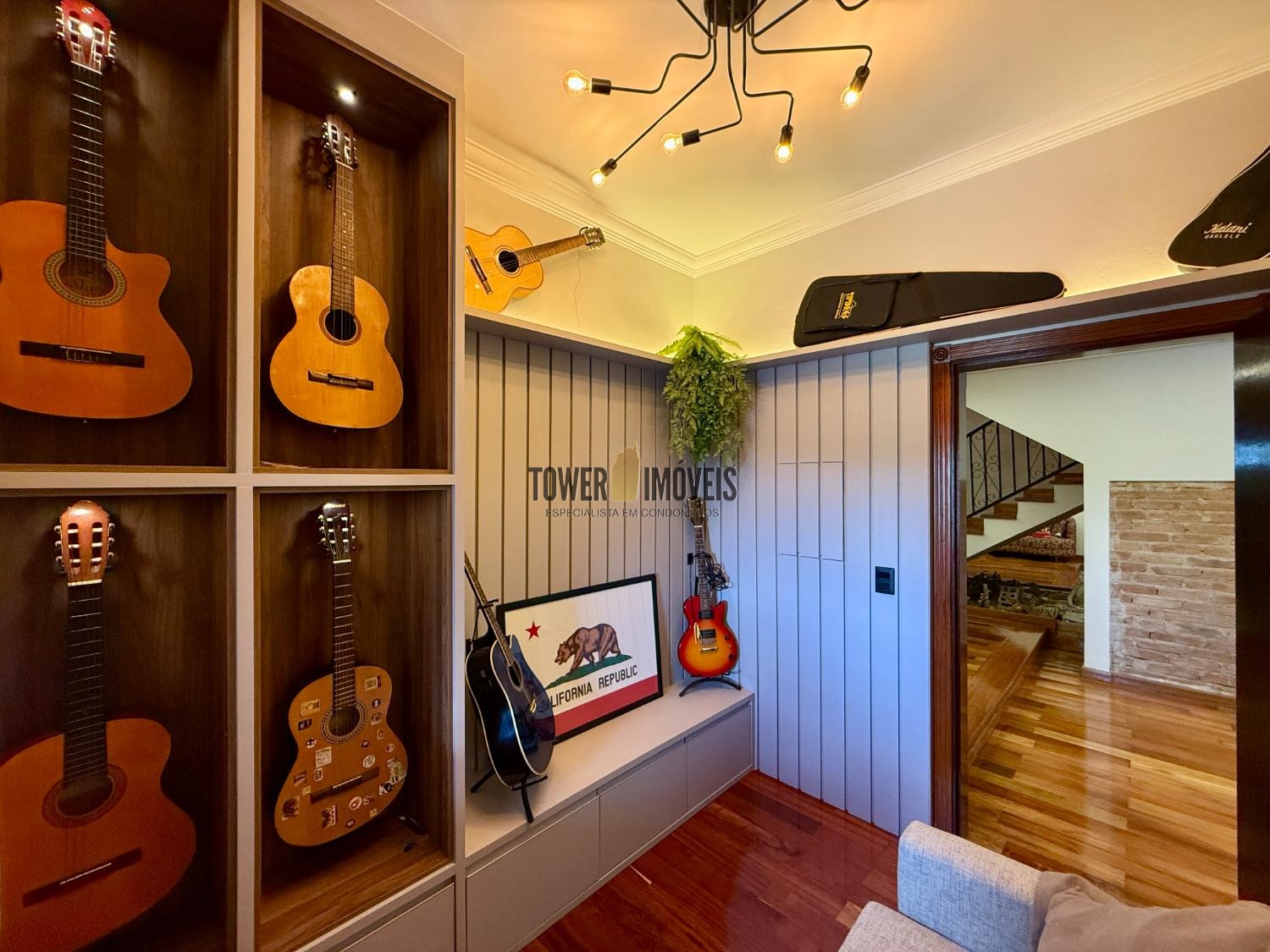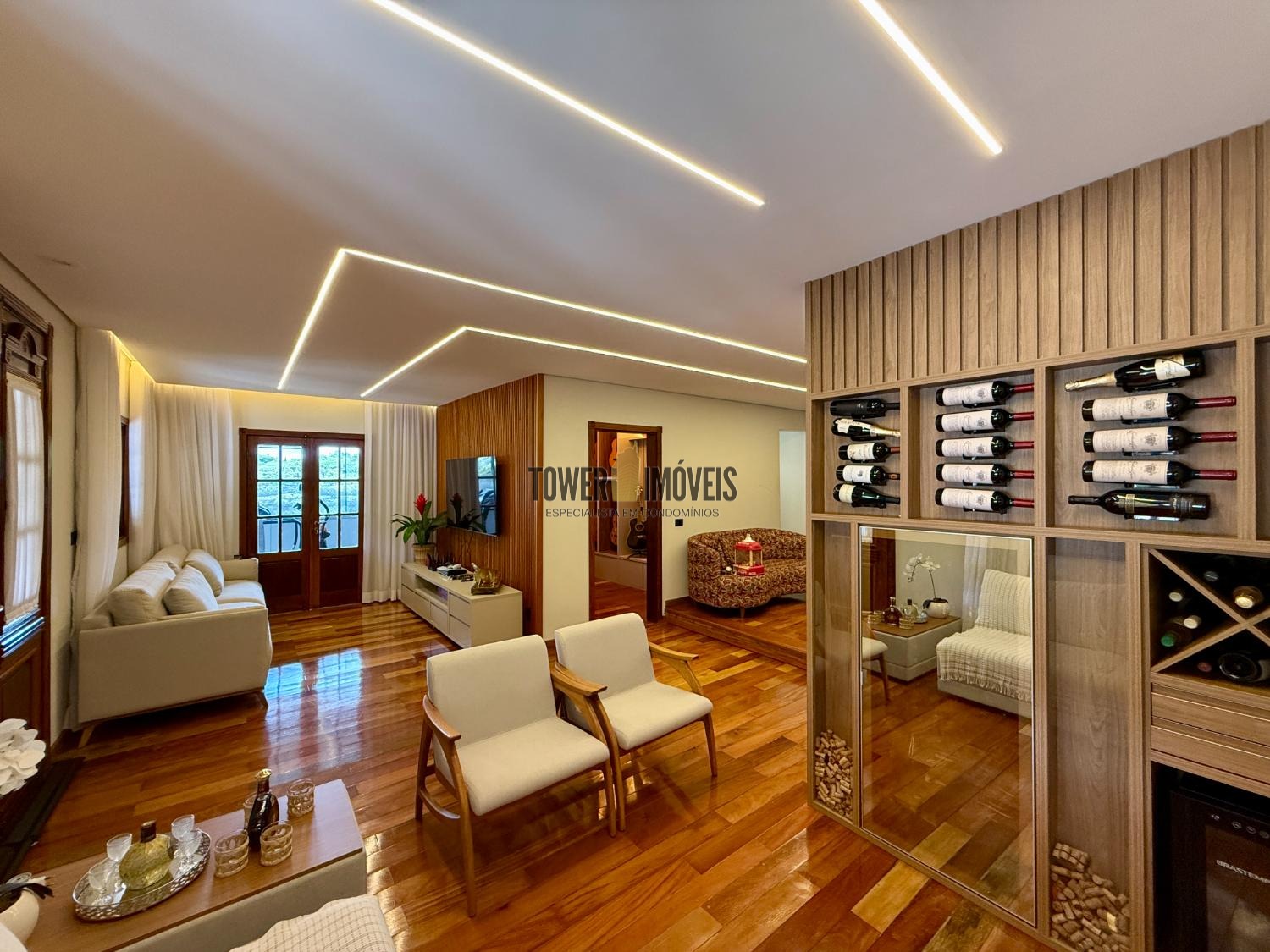 Piso Inferior: Um layout pensado para a convivência e o bem estar. Conta com cozinha planejada, despensa, sala de jantar, home theater e sala de TV. Para os momentos de lazer e cuidado pessoal, oferece uma adega exclusiva, academia privativa, uma charmosa sala de violão, lavabo e uma suíte completa com closet.