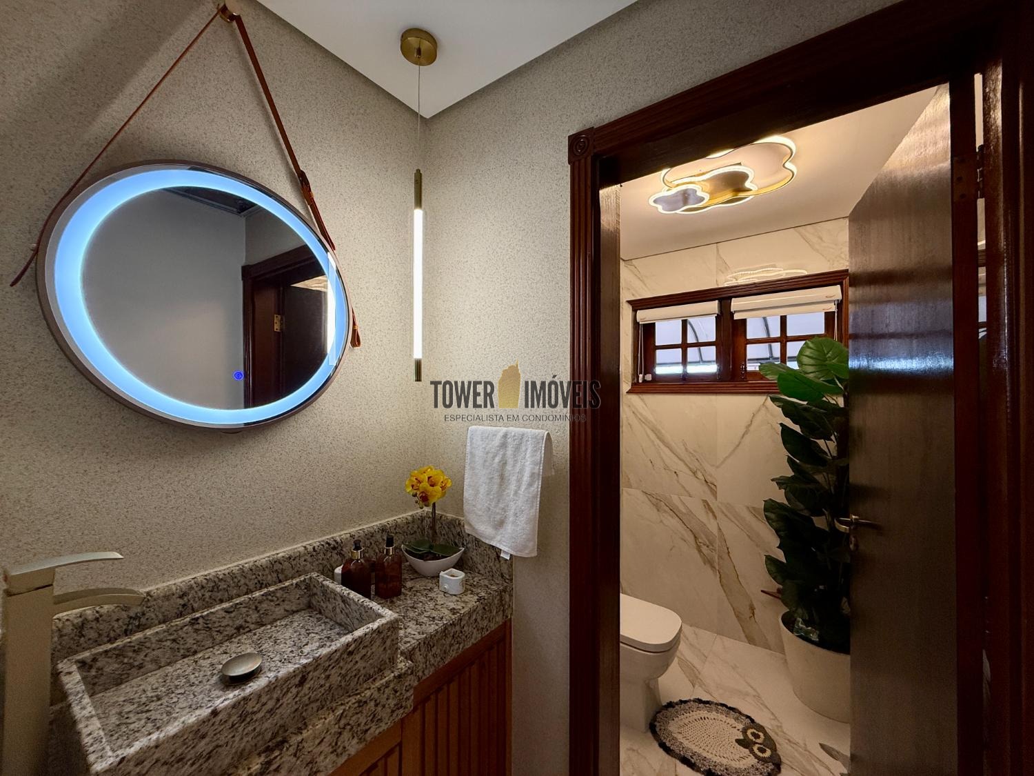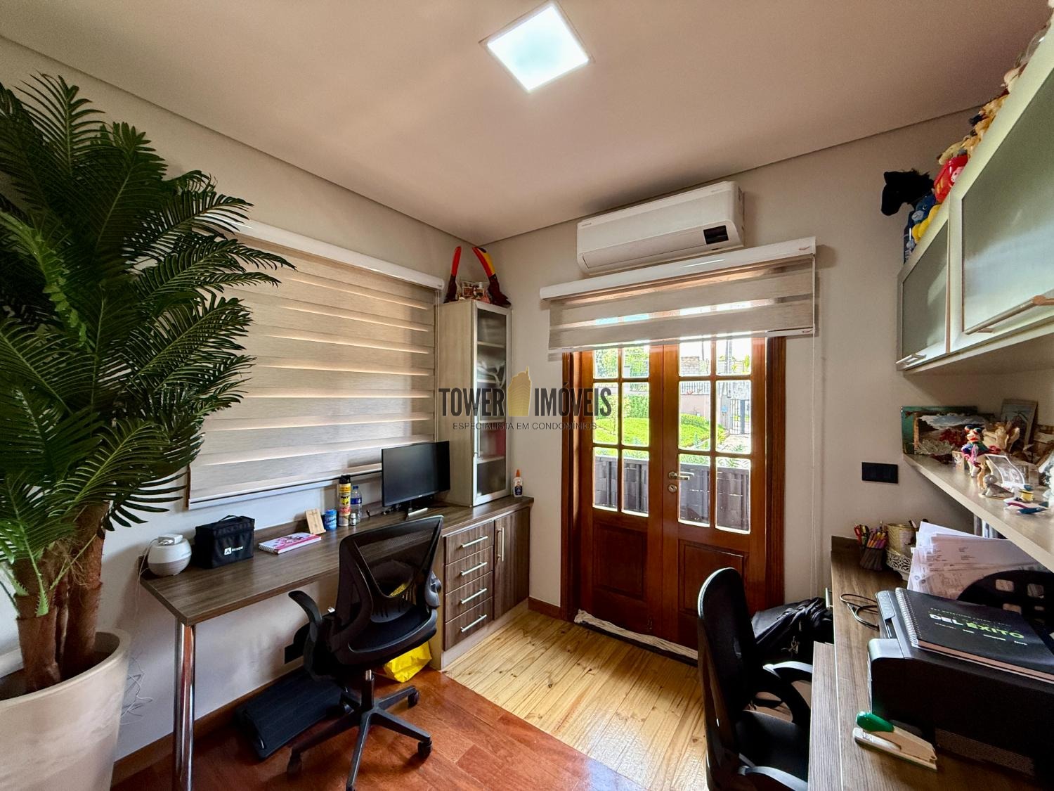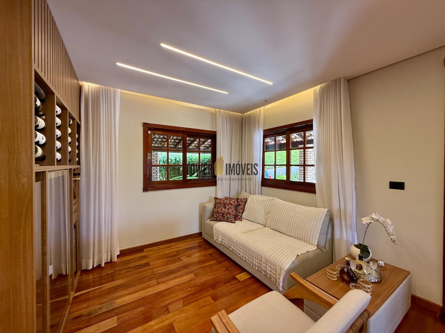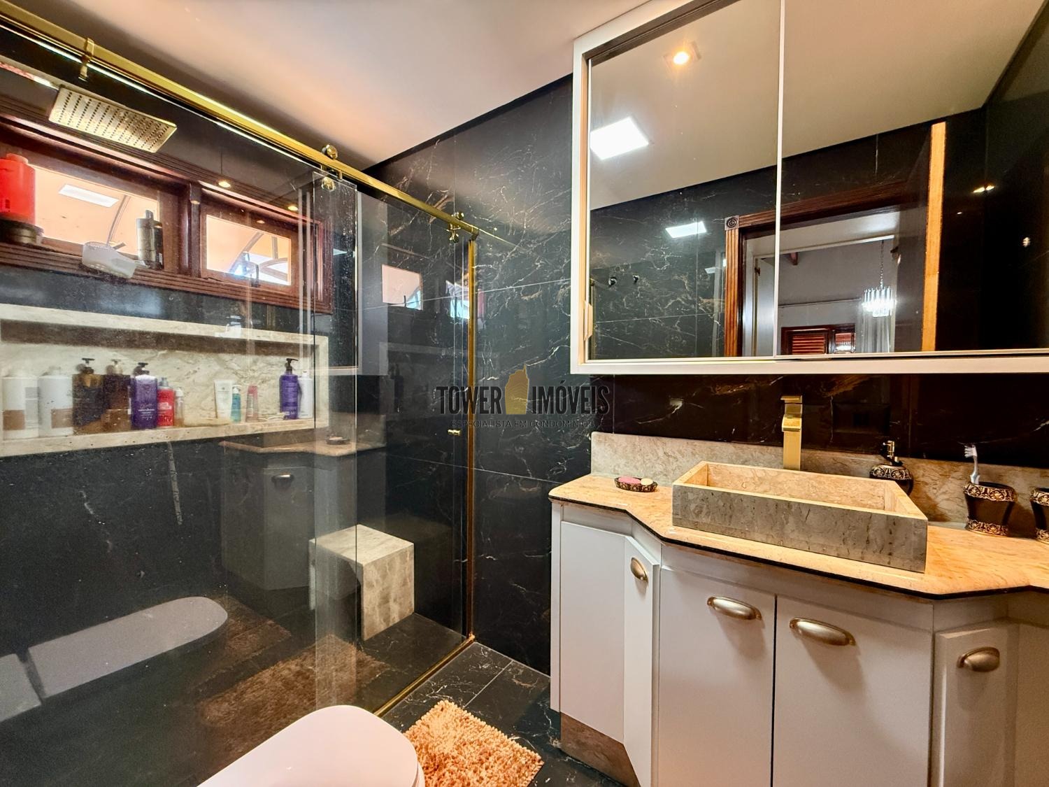 Piso Inferior: Um layout pensado para a convivência e o bem estar. Conta com cozinha planejada, despensa, sala de jantar, home theater e sala de TV. Para os momentos de lazer e cuidado pessoal, oferece uma adega exclusiva, academia privativa, uma charmosa sala de violão, lavabo e uma suíte completa com closet.