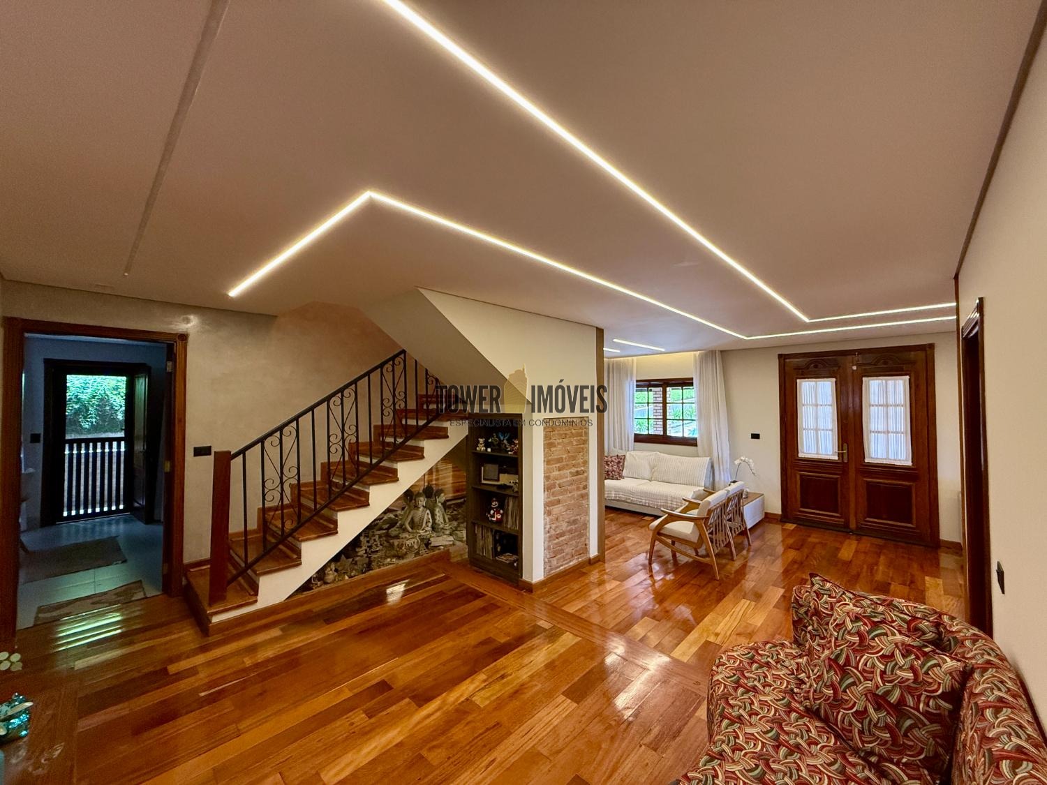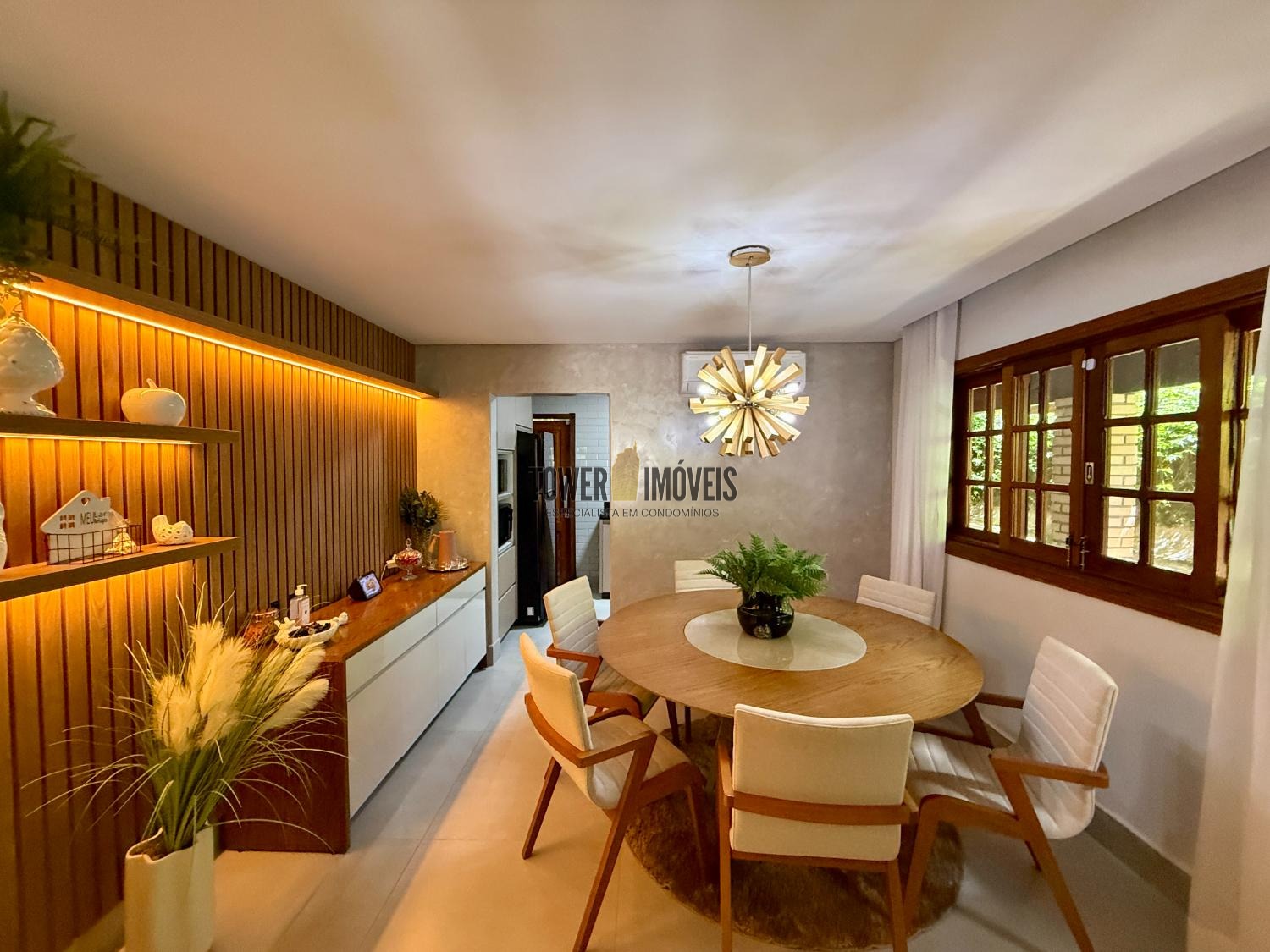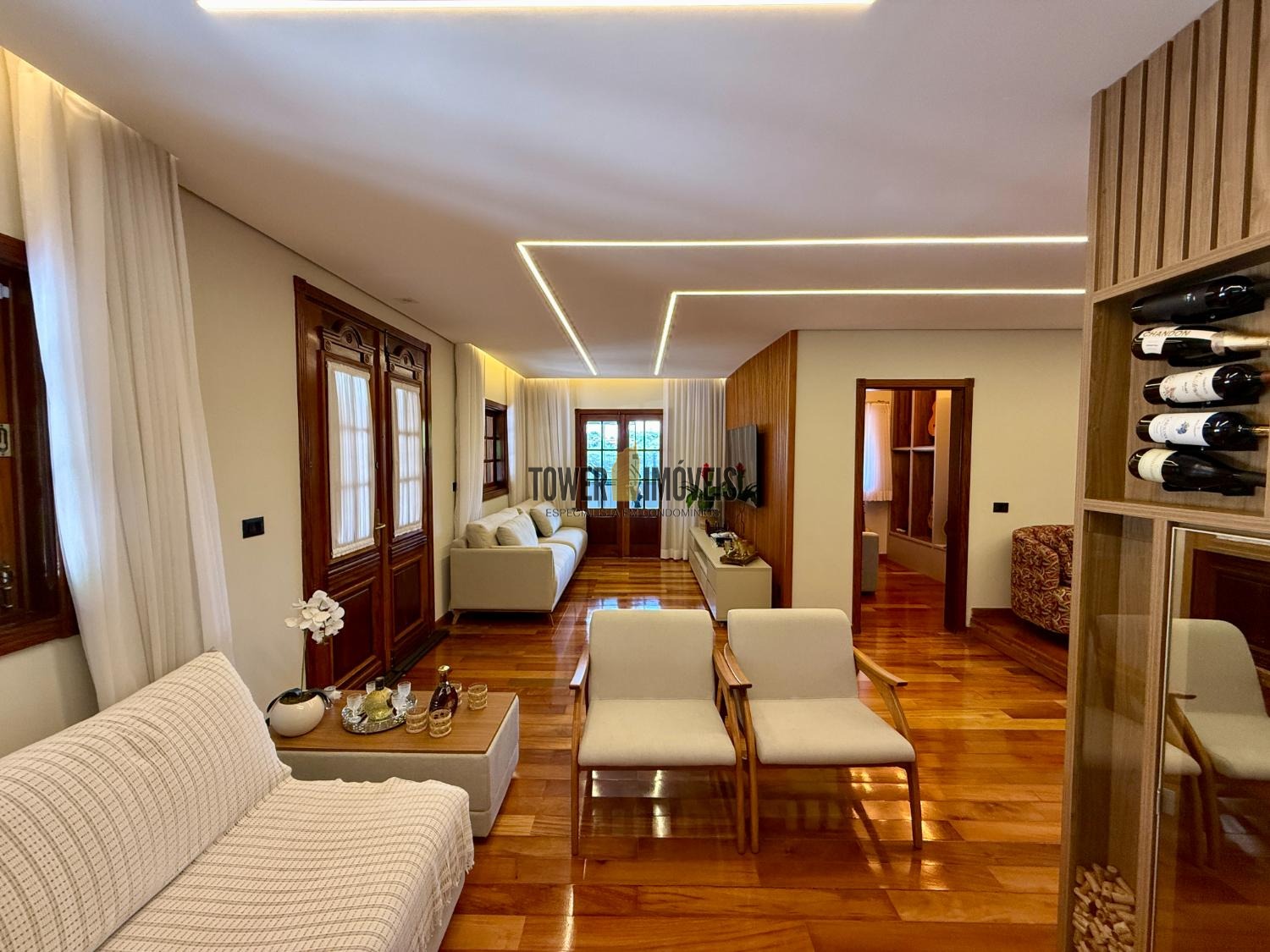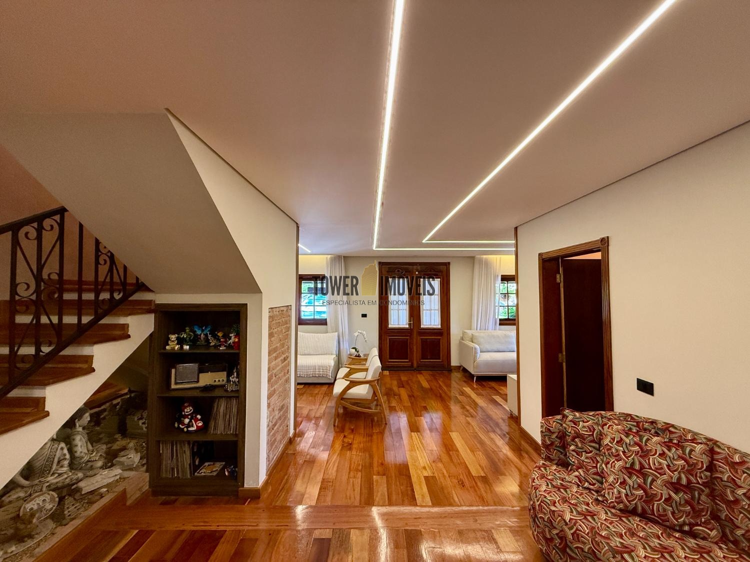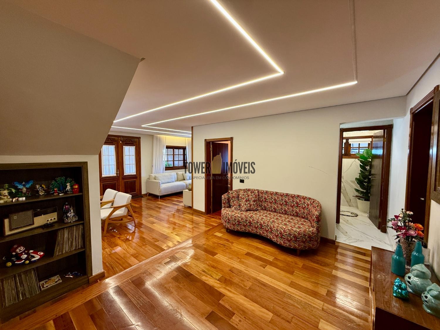 Piso Inferior: Um layout pensado para a convivência e o bem estar. Conta com cozinha planejada, despensa, sala de jantar, home theater e sala de TV. Para os momentos de lazer e cuidado pessoal, oferece uma adega exclusiva, academia privativa, uma charmosa sala de violão, lavabo e uma suíte completa com closet.